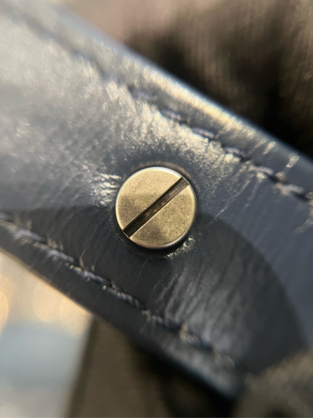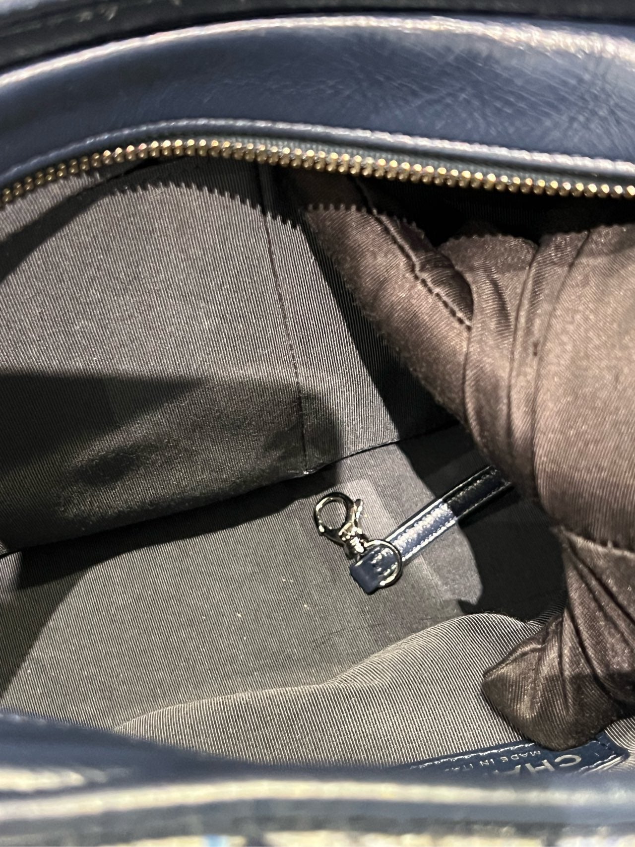 Features a striking combination of ruthenium-tone and gold-tone hardware. The signature chain-link shoulder strap, interwoven with navy blue leather, includes both ruthenium and gold-tone elements, offering a dynamic visual effect. The top closure is a zip with a gold-tone CC charm on the pull. Interior hardware includes a silver-tone lobster clasp.