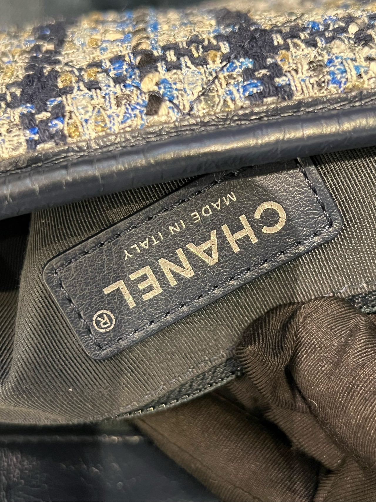 - Material: Bouclé tweed and calfskin leather