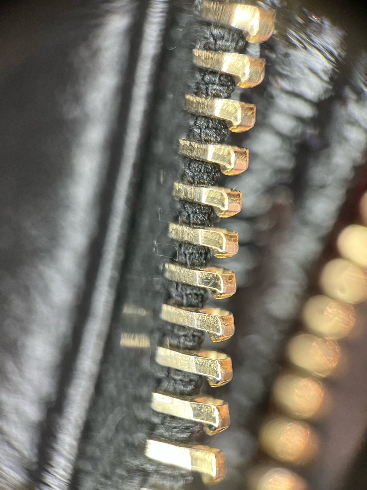 Showcasing a sophisticated mix of gold-tone and silver-tone hardware. The main zipper teeth and some chain links are gold-tone, while the zipper pull, strap buckles, and other chain links are silver-tone. The zipper pull is engraved with 'CHANEL' and the iconic CC logo. All hardware is functional and retains its luster, with minimal signs of wear.
