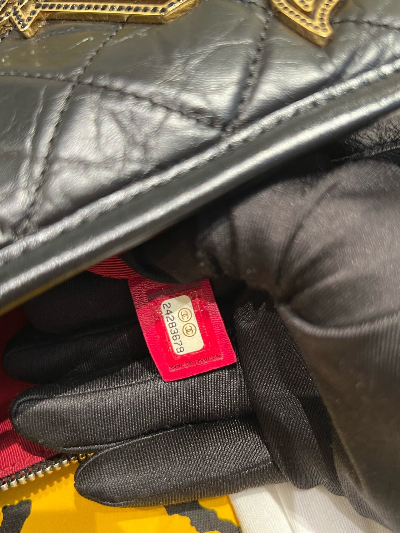 The interior is lined with a vibrant red grosgrain fabric, providing a striking contrast to the black exterior. It features a main compartment and a 'CHANEL Made in Italy' leather tag. The authenticity sticker with the serial number is securely attached inside. The lining appears clean and well-maintained.