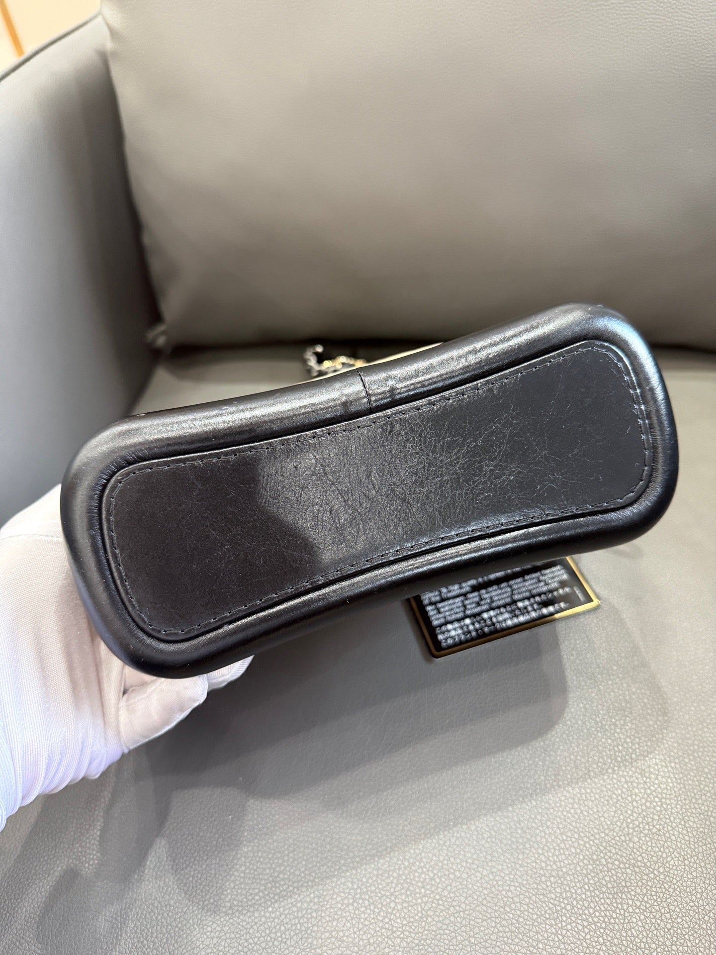 Distinguished by its innovative structure with a rigid base and supple upper body, allowing for a unique slouchy yet refined silhouette. The mixed-metal chain strap offers multiple styling options, including shoulder, crossbody, or wrist carry.