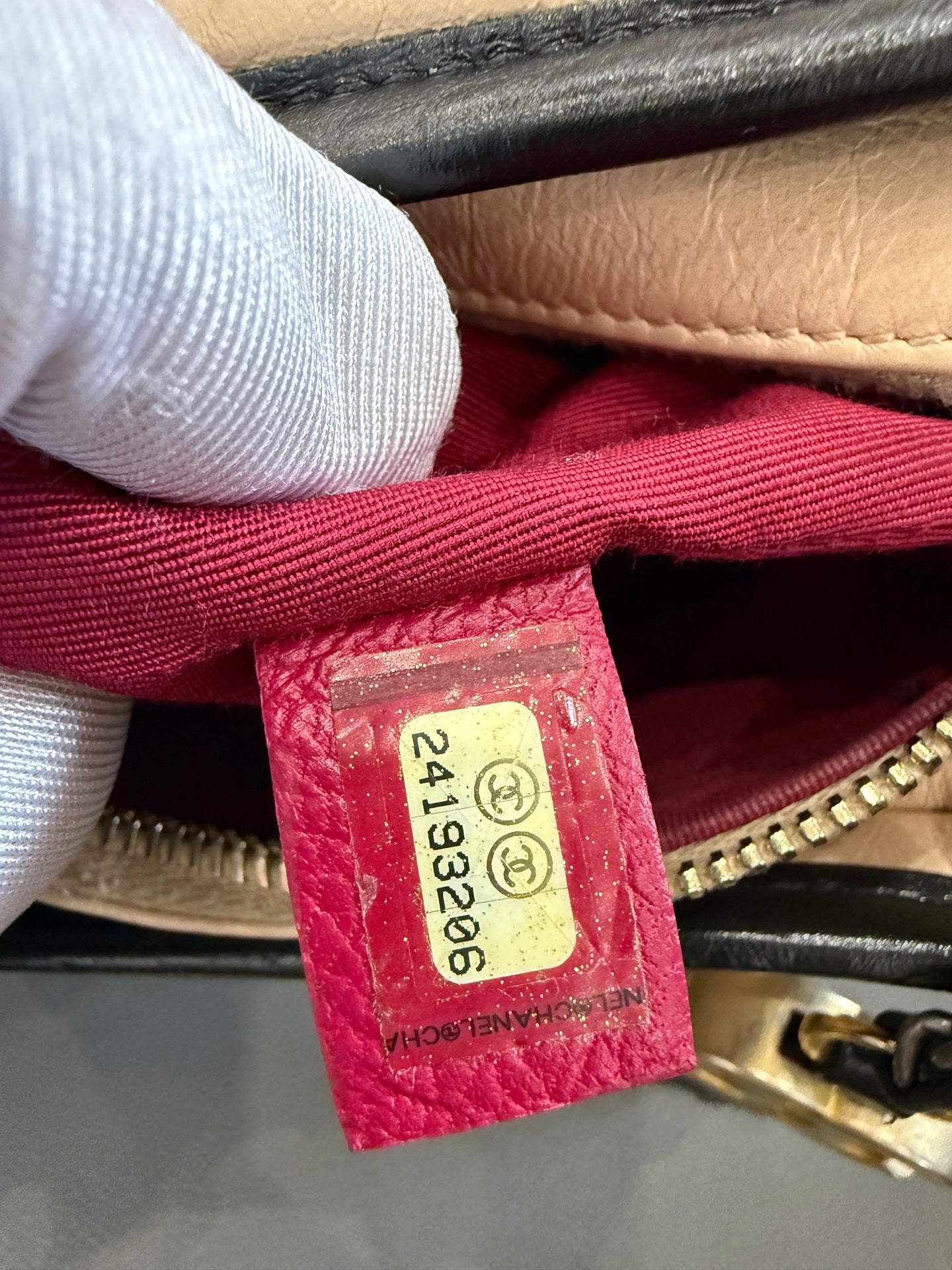 This Chanel Gabrielle Hobo Small bag is in very good pre-owned condition. The exterior shows minimal signs of wear. The beige aged calfskin leather retains its supple, slightly distressed texture with well-defined diamond quilting. The black smooth calfskin base is structured and shows light signs of handling consistent with gentle use. The mixed-tone hardware, including the interwoven chain strap and CC charm, remains bright with minor surface scratches. The interior is clean with no significant marks or odors.