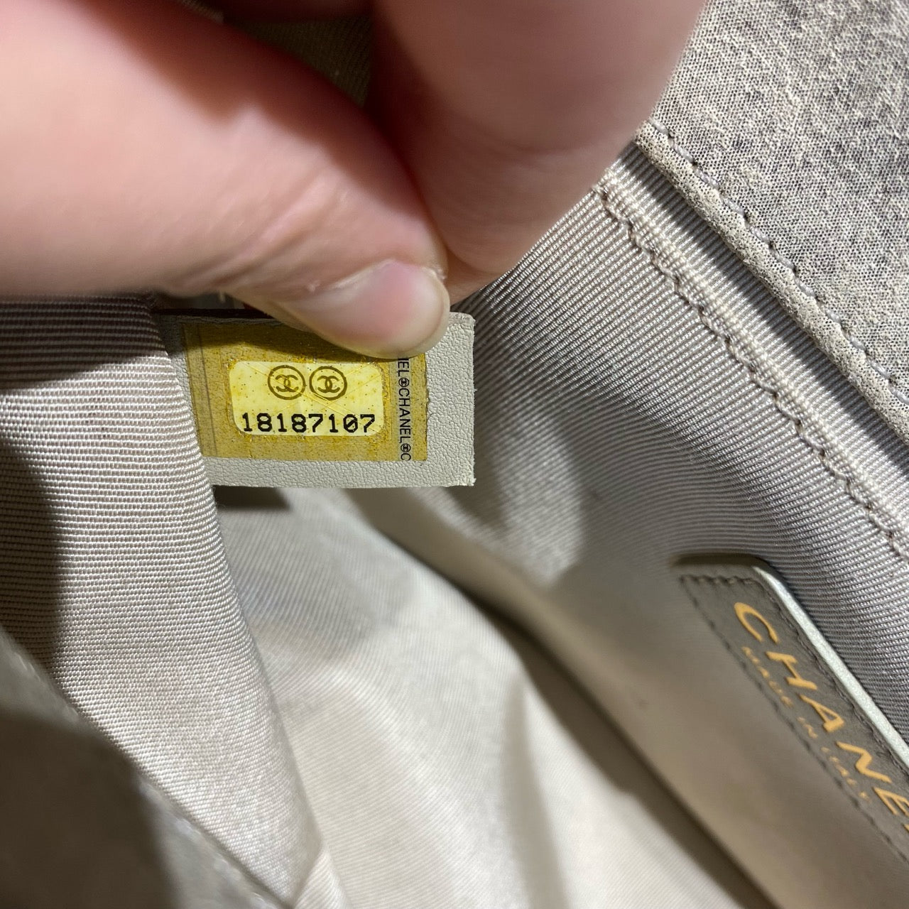 The interior is lined with a textile fabric, presenting a generally clean appearance, though it's difficult to ascertain its condition fully from the provided images. A Chanel authenticity sticker bearing the serial number '18187107' is affixed inside. An internal 'CHANEL MADE IN ITALY' leather plaque is visible, indicating its origin.