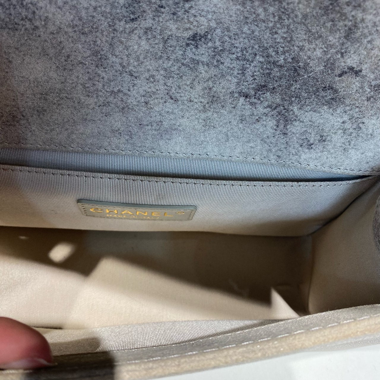 The hardware is finished in an antique gold-tone, complementing the distressed aesthetic of the suede. It includes the prominent Boy Chanel push-lock mechanism, which is fully functional, and the iconic chain-link strap interwoven with a matching suede shoulder pad. The hardware shows general signs of use, including some dulling and minor surface scratches, but no significant damage or missing components.