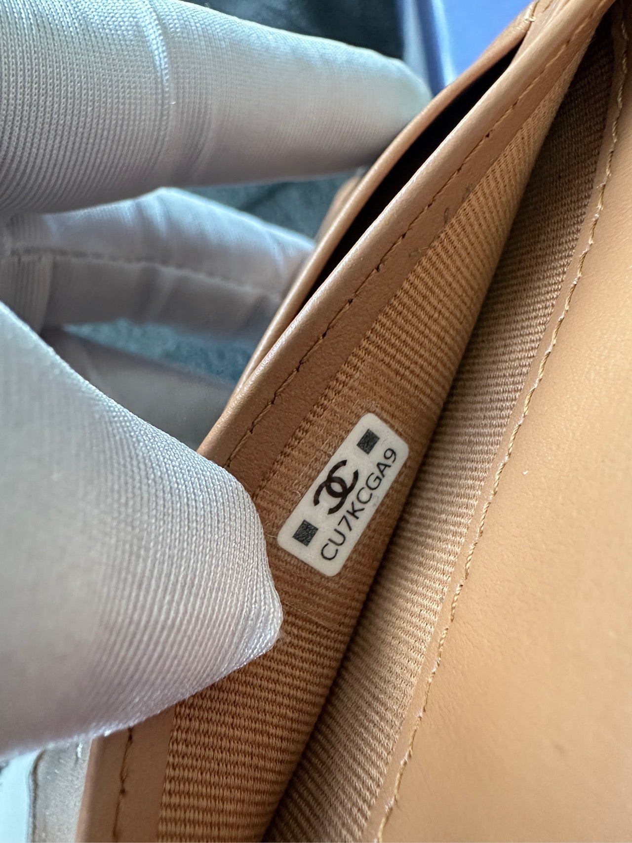 The interior is lined with matching beige leather, offering a streamlined and functional design. It includes multiple slip pockets suitable for a passport and several card slots. The 'CHANEL' and 'MADE IN ITALY' stamps are clearly legible, along with a modern authenticity sticker bearing the code 'CU7KCGA9'.