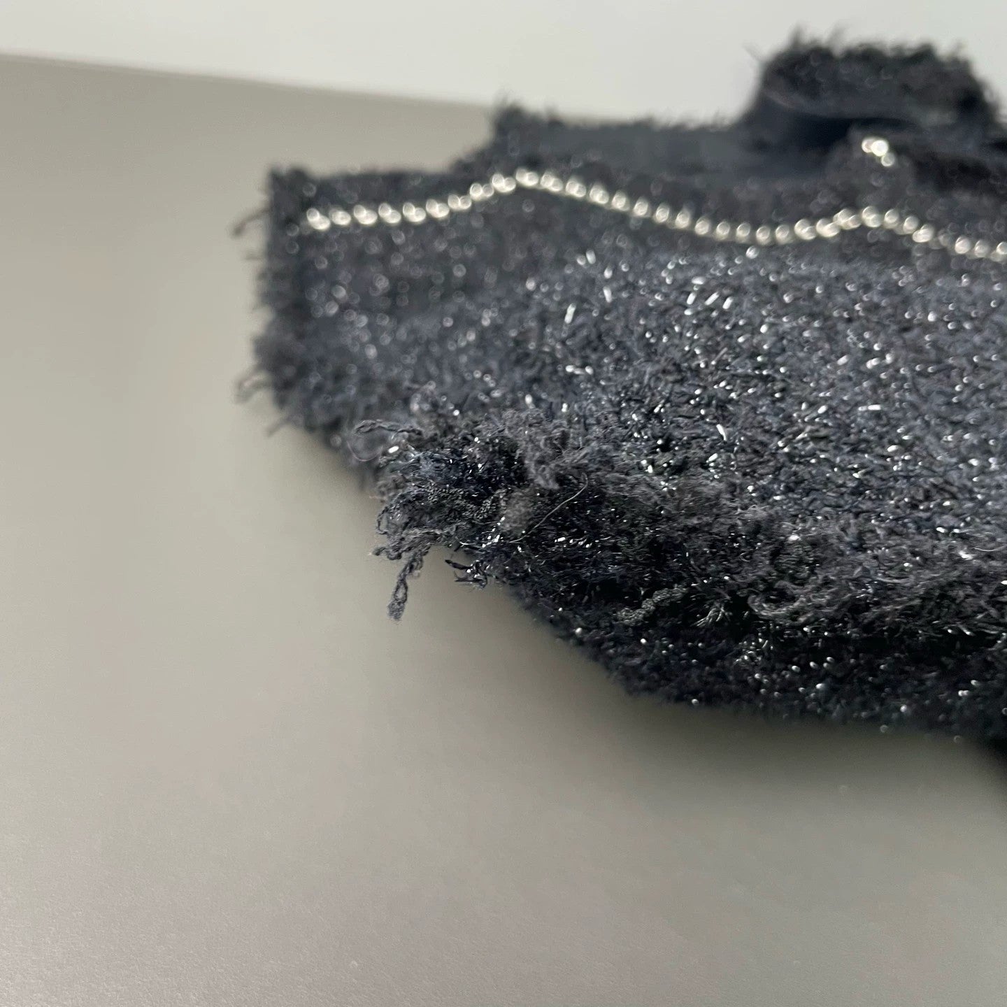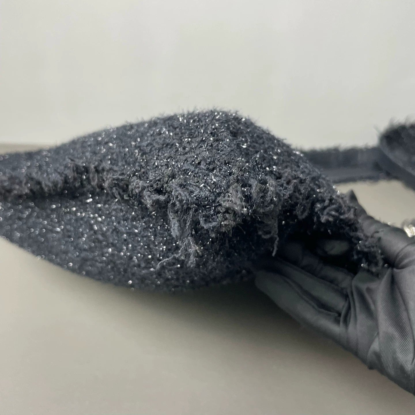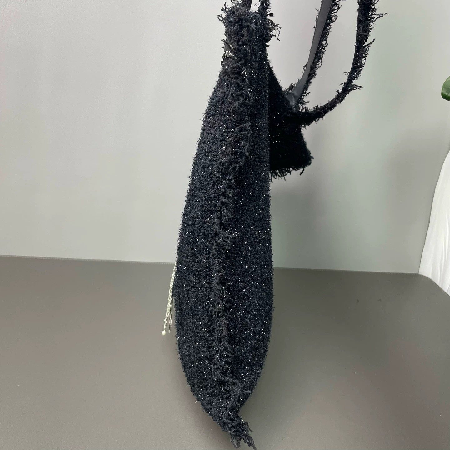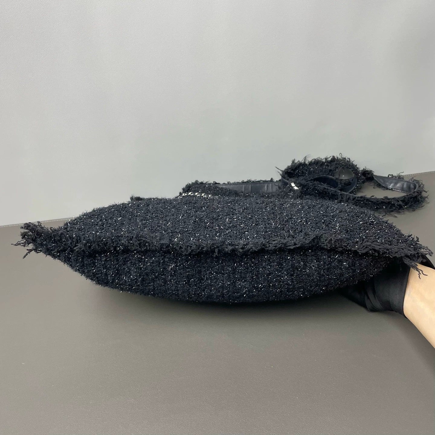Crafted from a luxurious black shaggy tweed fabric, interwoven with subtle metallic silver threads that catch the light. The front features a prominent, three-dimensional silver-tone rocket appliqué adorned with fine chain tassels, adding a playful yet luxurious touch. The top edge of the bag is detailed with a delicate silver-tone chain accent. The bag's overall structure is soft and pliable, characteristic of a tote style.