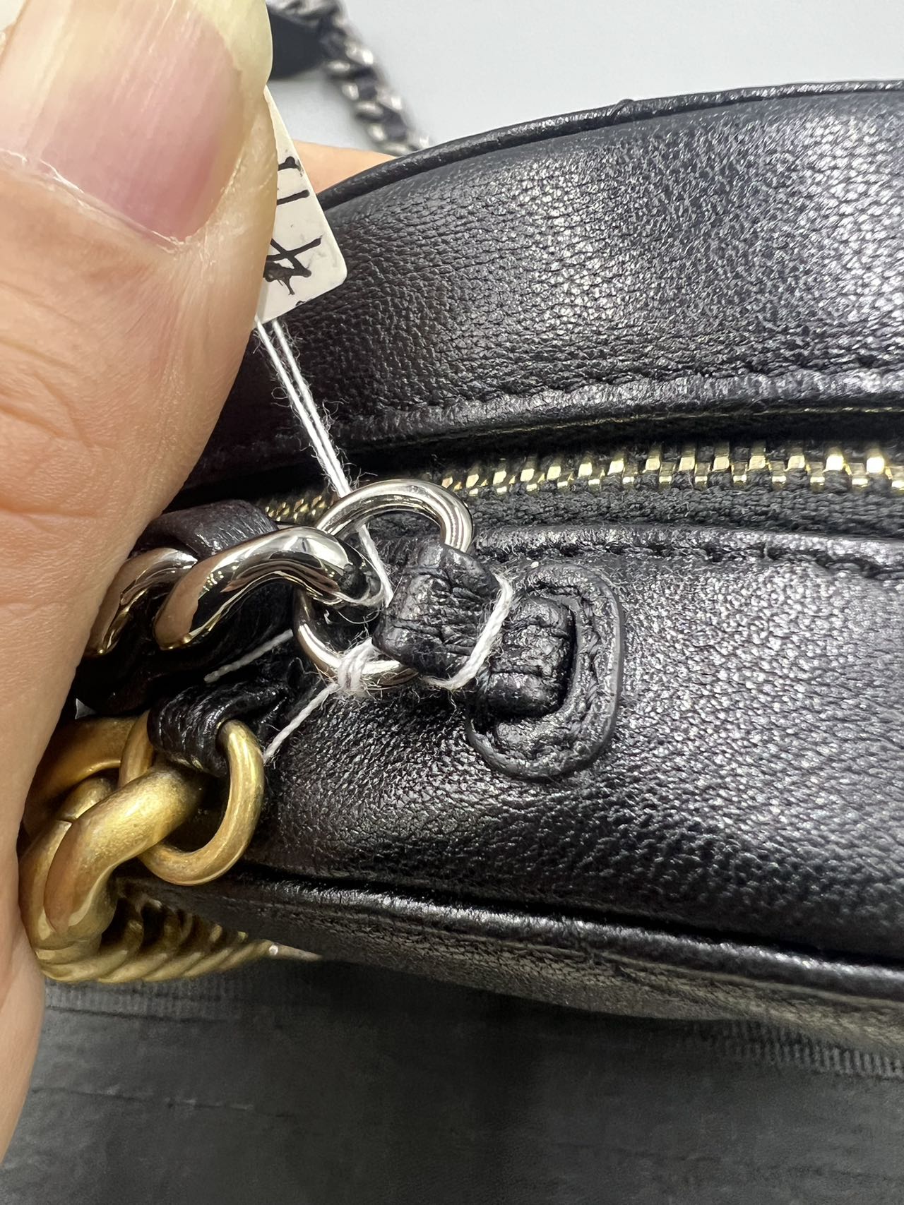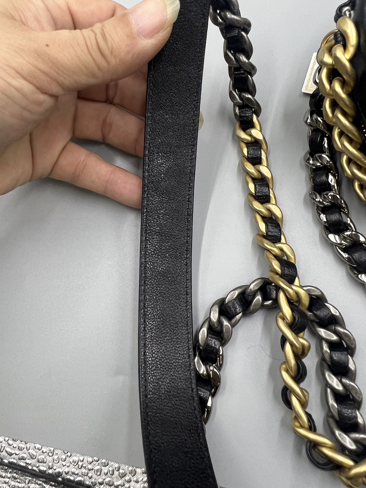 The bag boasts a striking combination of gold-tone and silver-tone hardware. The iconic CC logo is in gold-tone with interwoven black leather. The versatile chain strap is interwoven with black leather and features both gold-tone and silver-tone links, allowing for shoulder or crossbody wear. A top zipper provides secure closure for the main compartment.