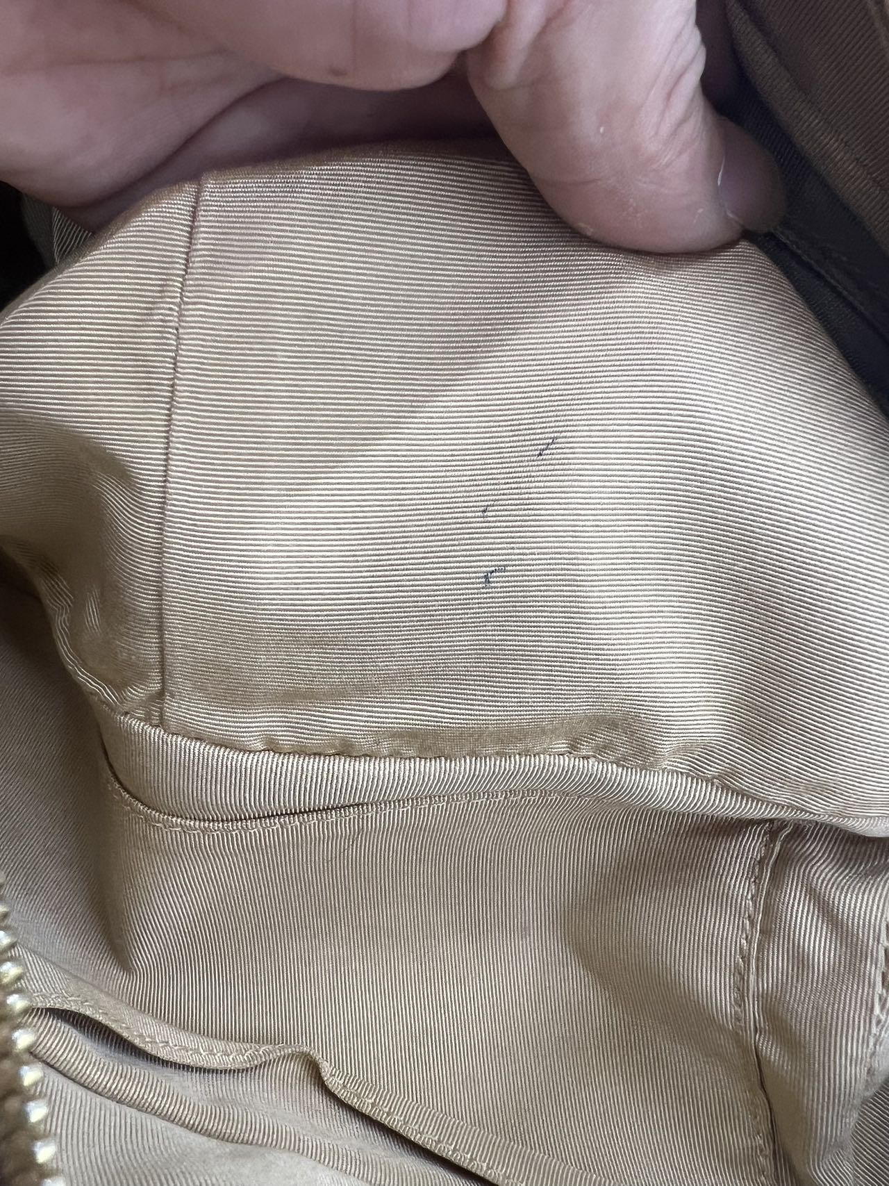 Interior lining shows pen marks/dirt. Minor scuffs on bottom corners. Hardware shows hairline scratches and some loss of plating.
