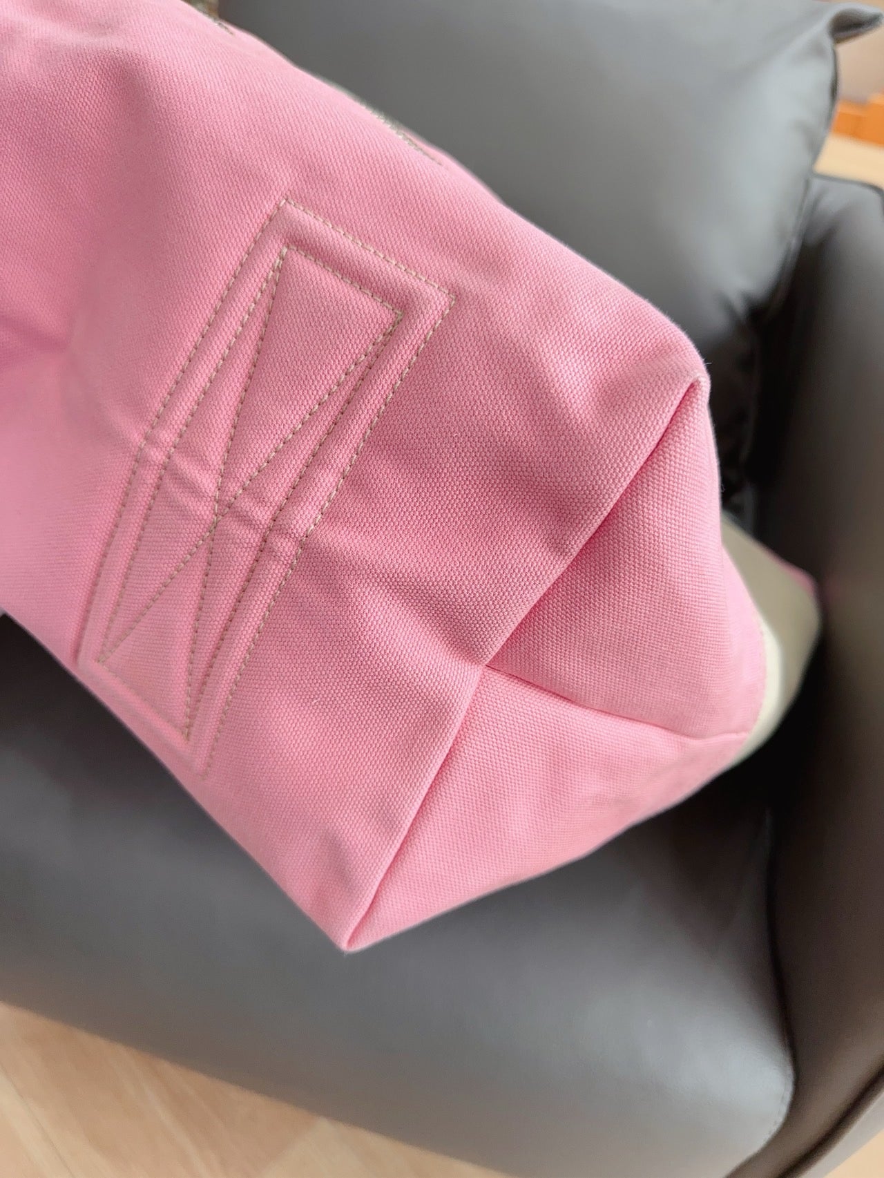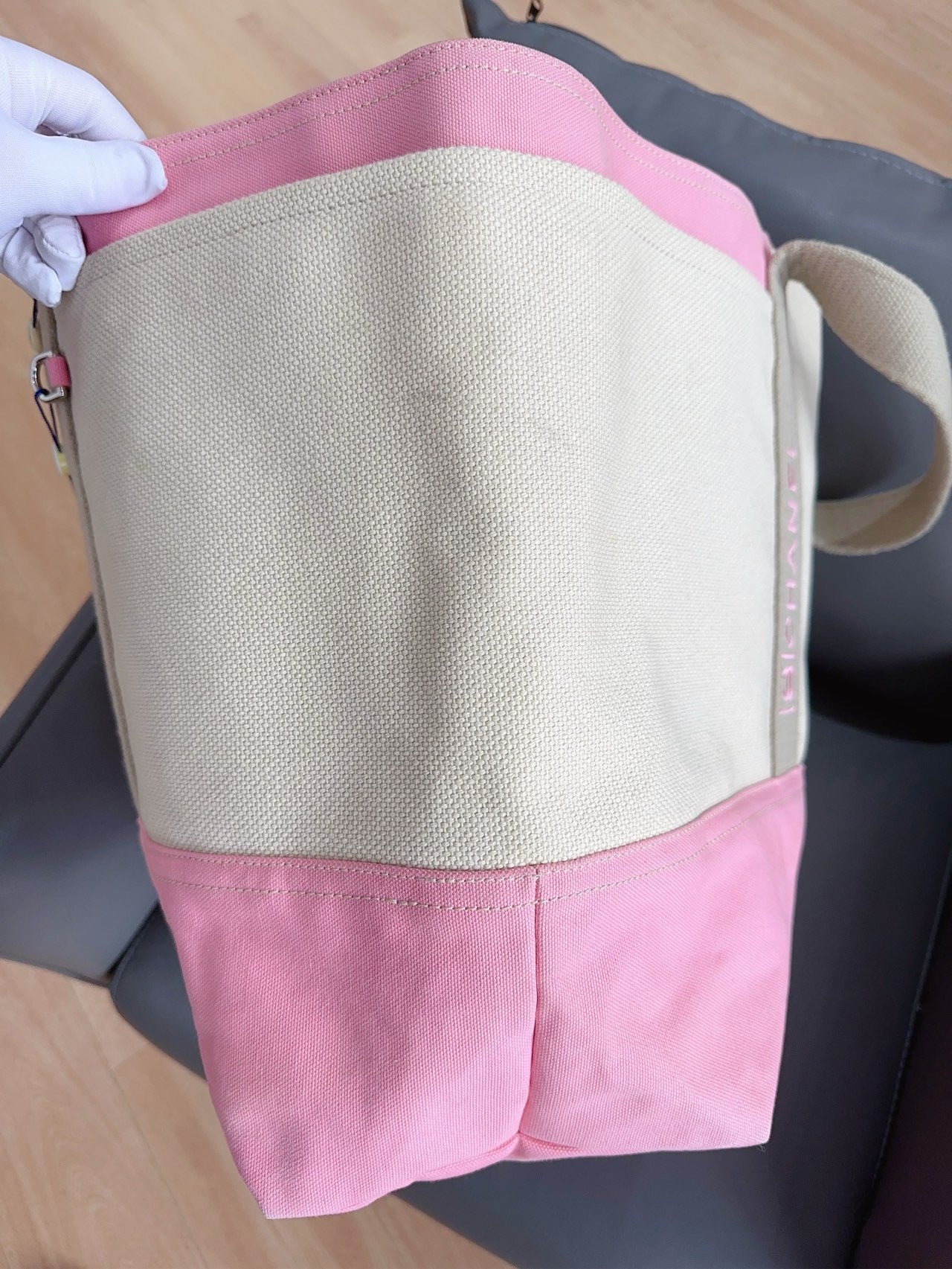 Crafted from durable canvas, featuring a sophisticated two-tone design with a beige main body and contrasting pink trim along the top edge and bottom base. The front panel proudly displays an embroidered 'CHANEL' logo with the iconic interlocking CC motif in matching pink. The bag is equipped with sturdy canvas top handles, designed for comfortable shoulder or hand carry. The side panels are unadorned, allowing for a clean silhouette, while the base features stitched details suggesting structural support.