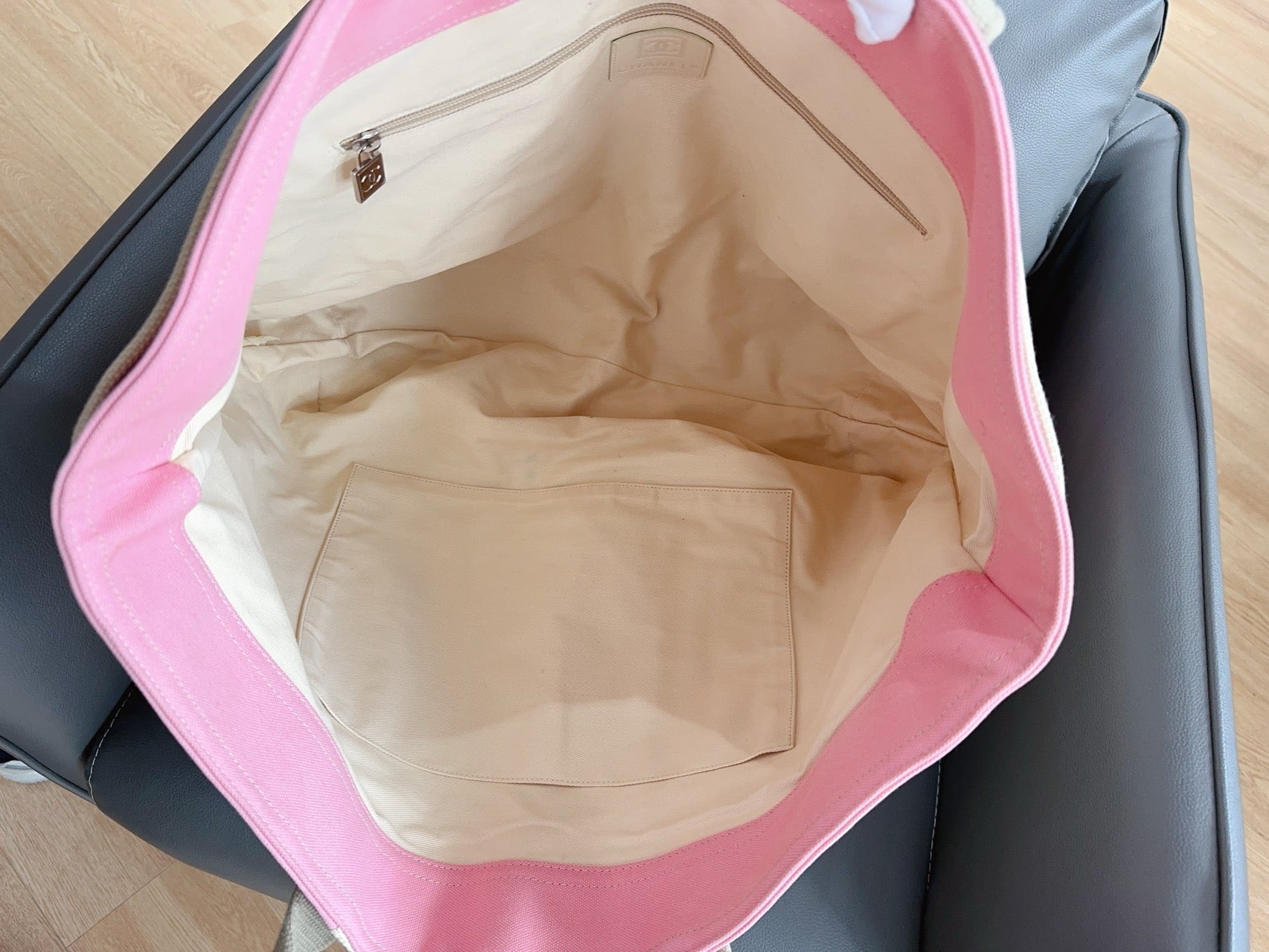 The generous dimensions make this an ideal versatile tote for various occasions, from daily errands to beach outings. The two-tone aesthetic and embroidered branding provide a distinctive yet classic Chanel appeal. The robust canvas construction ensures durability for everyday use.