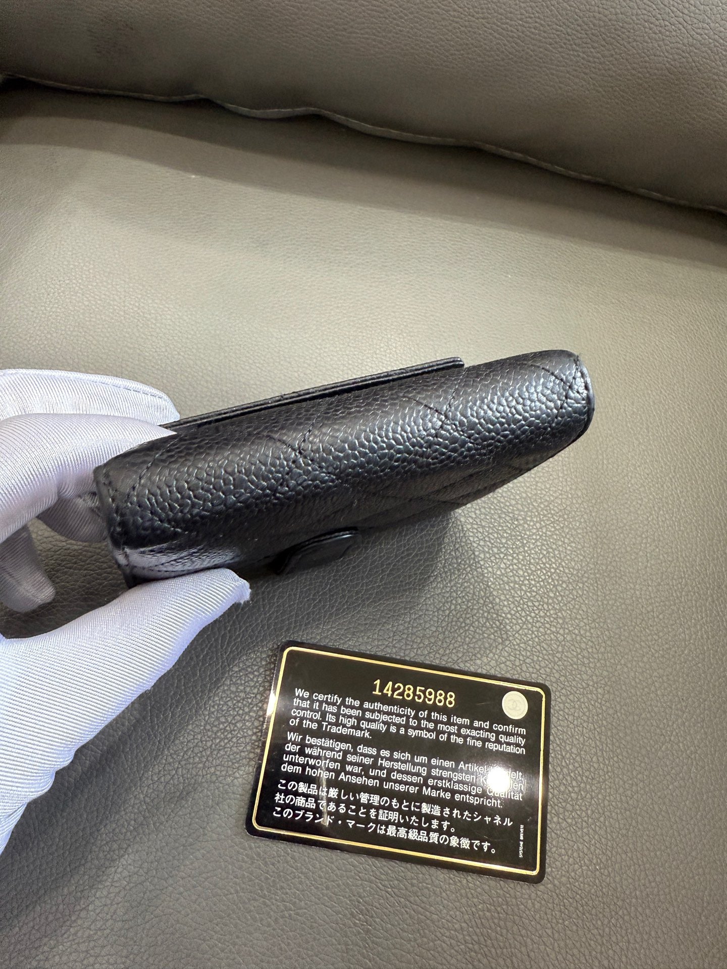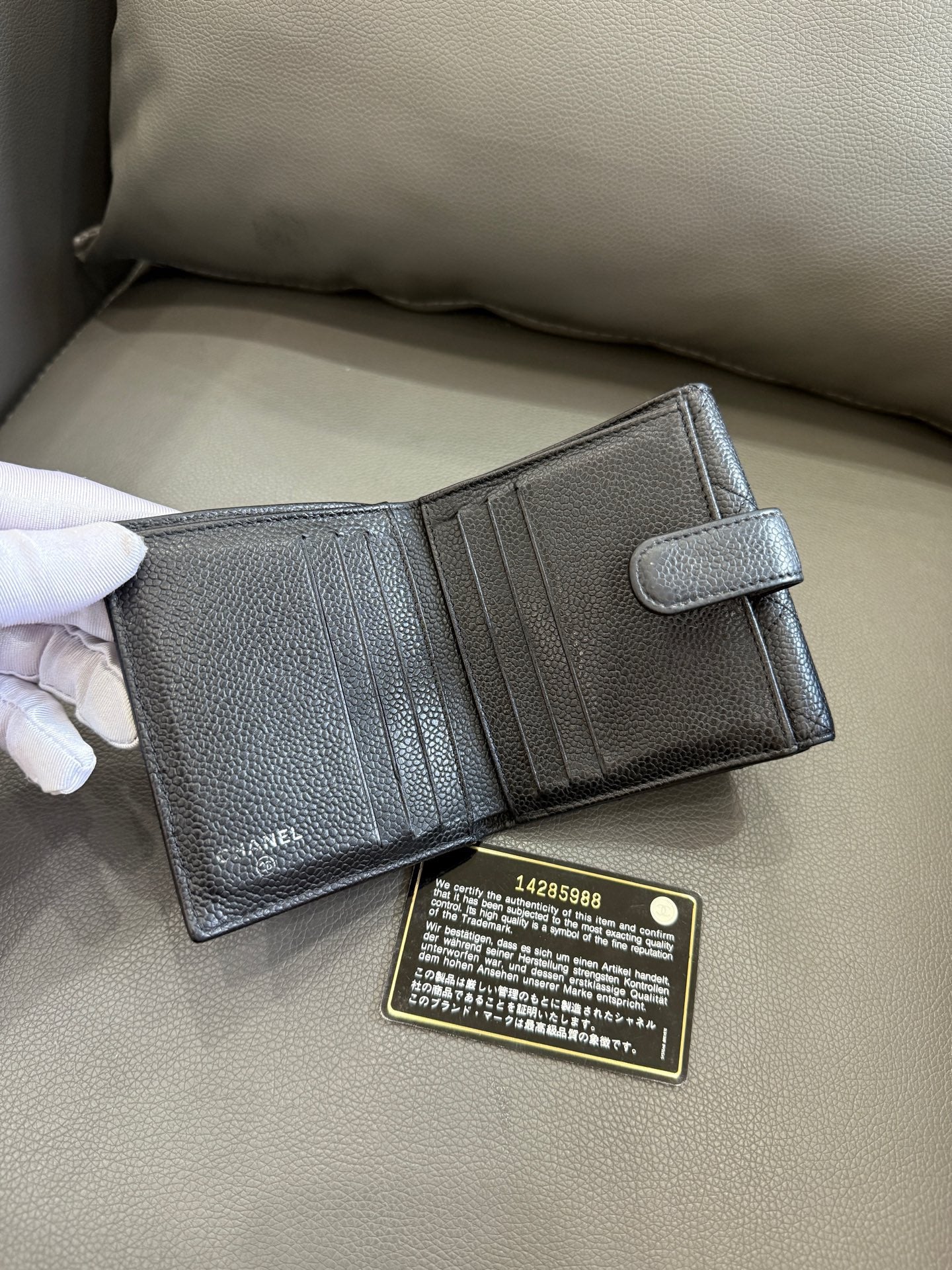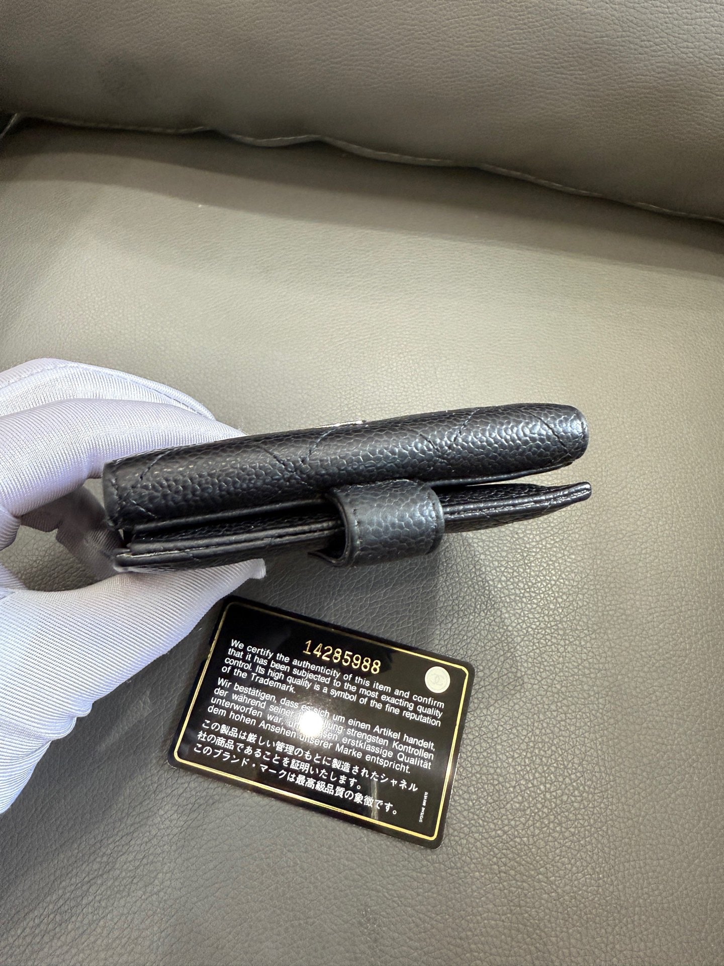 Crafted from durable black caviar leather, known for its textured, pebbled finish. The front flap features iconic diamond quilting and a prominent interlocking silver-tone CC logo. The overall structure of the wallet is well-preserved, with minimal creasing. Edges and corners show minor wear, typical for a pre-owned item.