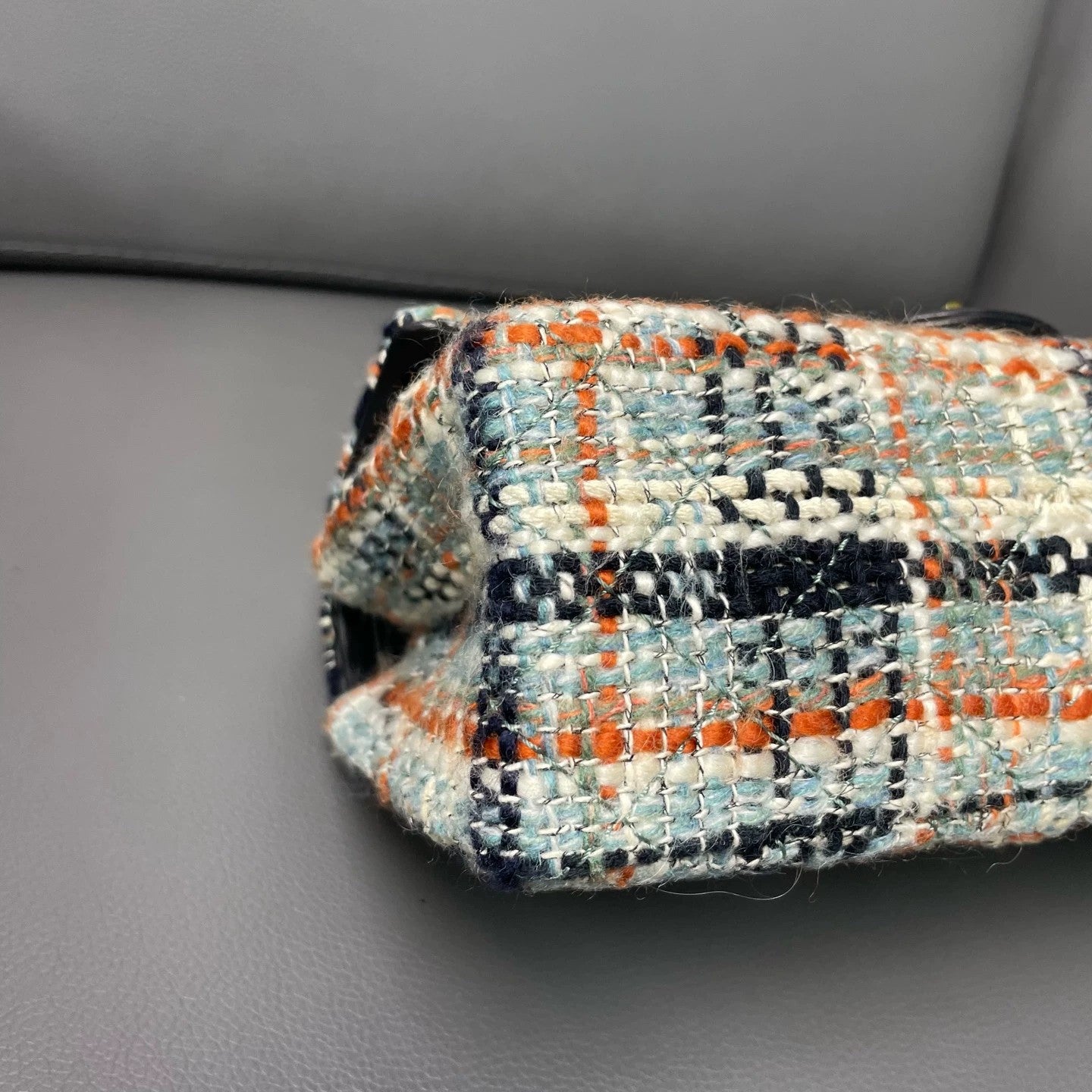 The bag features a distinctive multicolour tweed exterior woven in a plaid pattern, incorporating black, white, blue, and orange threads. The tweed is diamond-quilted, giving it texture and depth. Black leather trim borders the edges and the underside of the flap, providing a refined contrast. The overall structure is firm, with no visible sagging or distortion.