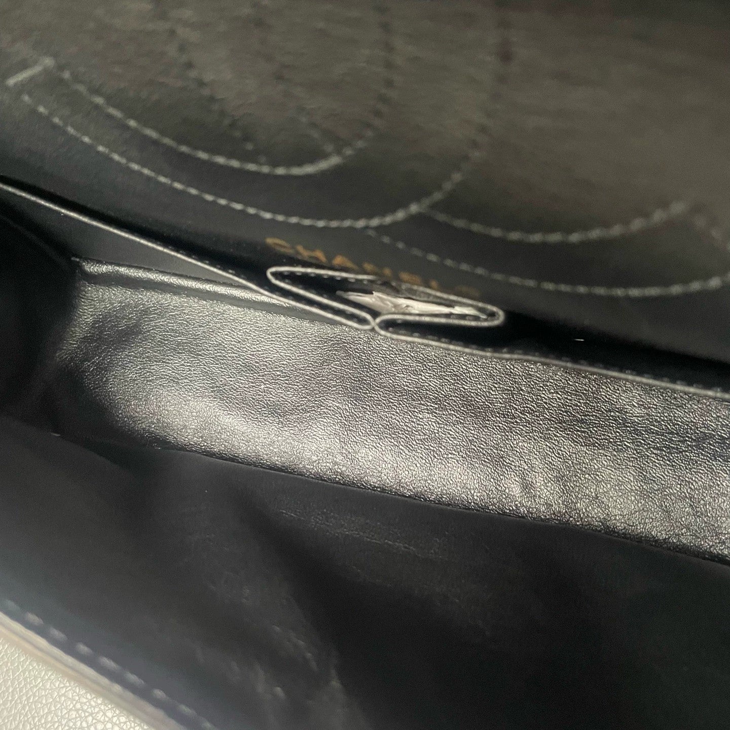The interior is lined with smooth black leather, offering a luxurious feel. It features a spacious main compartment, along with various pockets typical of Chanel flap bags, including a zipped pocket under the main flap and slip pockets within the main compartment. The Chanel logo is subtly embossed or stitched under the flap. The lining is clean and well-maintained.