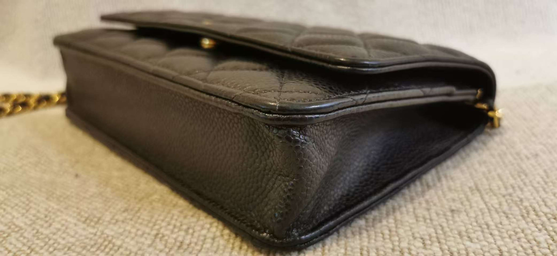 This Chanel Wallet on Chain (WOC) in black Caviar leather is in very good pre-owned condition. The exterior Caviar leather retains its structured shape and iconic diamond quilting, with minimal signs of wear. The gold-tone hardware, including the CC logo and chain strap, remains bright with minor superficial scratches, particularly noticeable on the magnetic snap closure. The interior is clean and well-maintained. All stitching is intact.