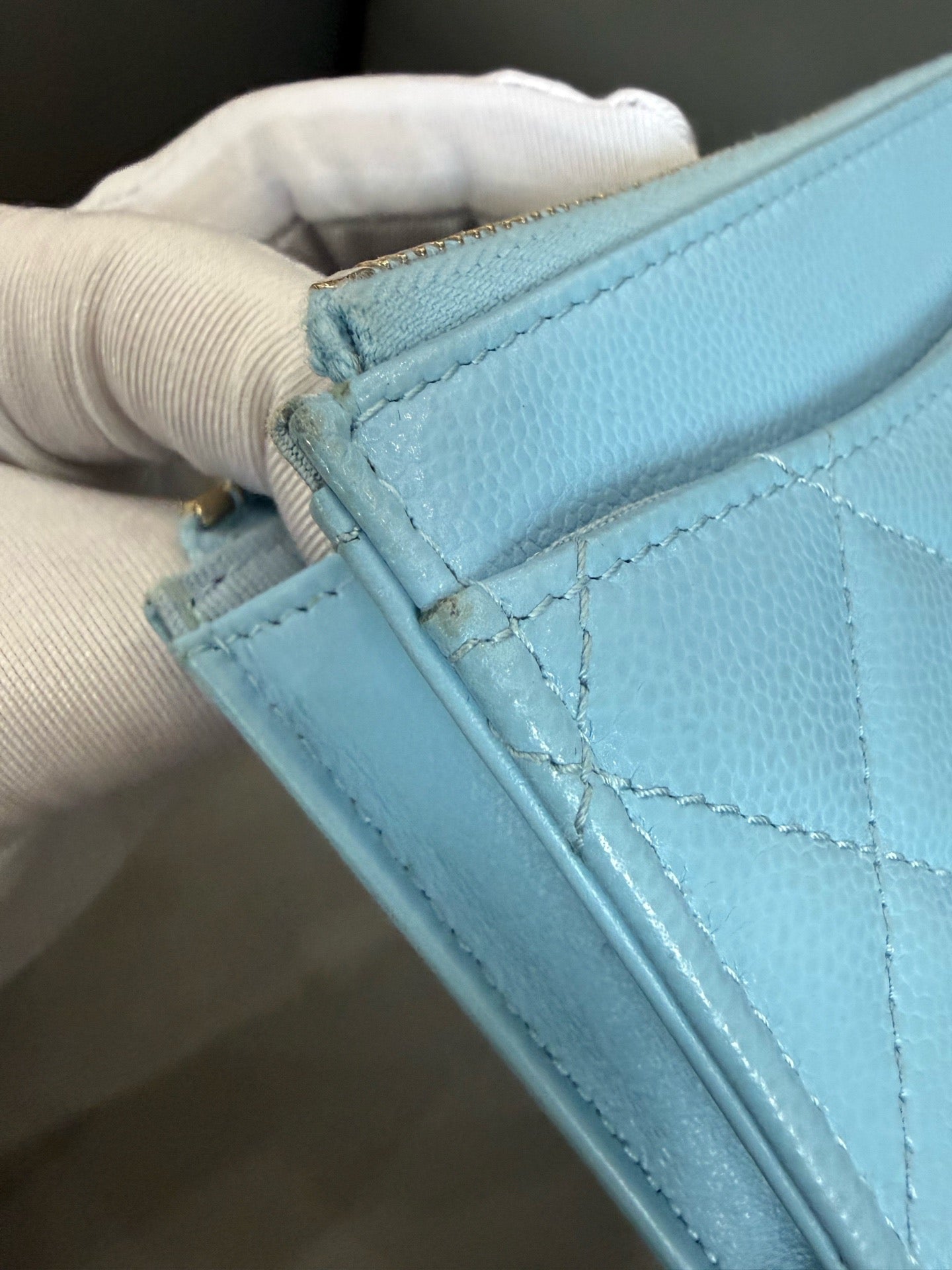 Crafted from durable light blue grained calfskin leather, featuring Chanel's iconic diamond quilting on both the front and back. The front is adorned with a small gold-tone interlocking CC logo. The back panel includes four practical card slots. There is noticeable wear on all four corners and along the leather piping, with some slight darkening and rubbing. The overall structure remains good despite the wear.