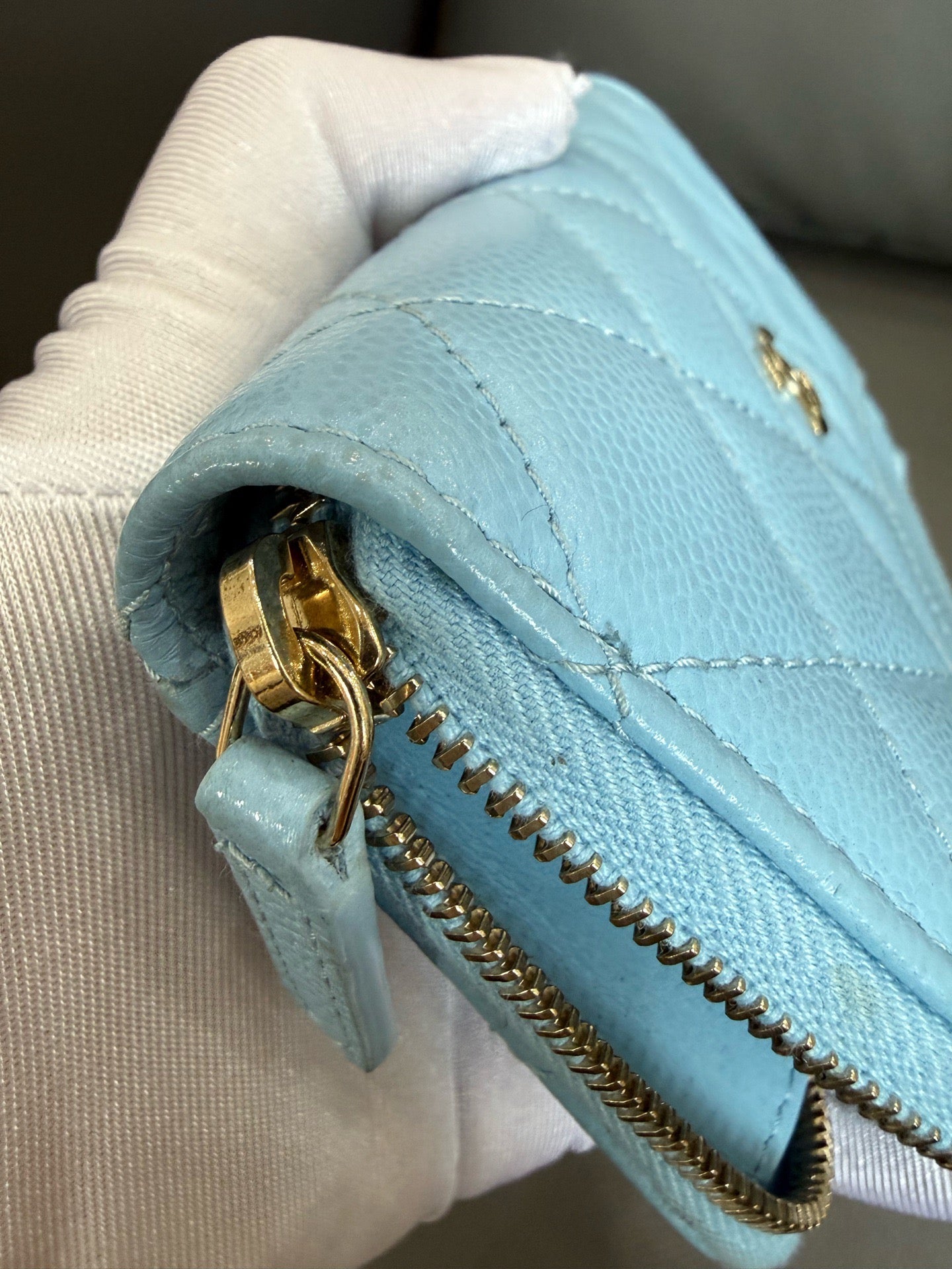 This Chanel Zipped Card Holder is in good pre-owned condition, showing signs of gentle use consistent with its age. The light blue grained calfskin exterior has some softening and minor surface wear. All four corners exhibit rubbing and slight discoloration, indicating regular handling. The leather edges around the zipper also show some minor wear. The gold-tone hardware, including the zipper and CC logo, remains functional with some light scratches. The interior is clean.