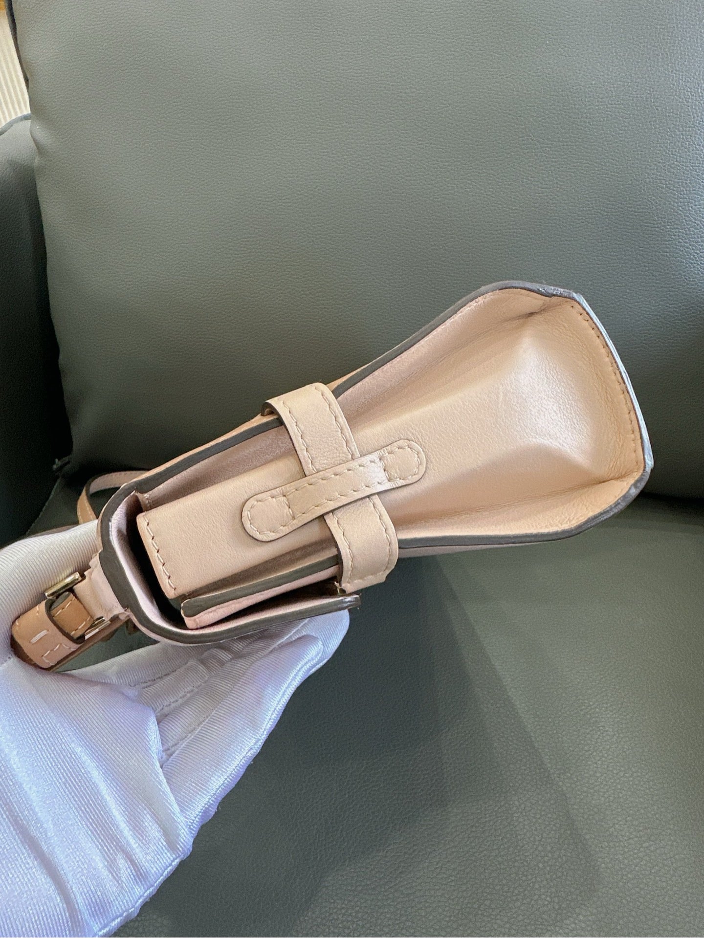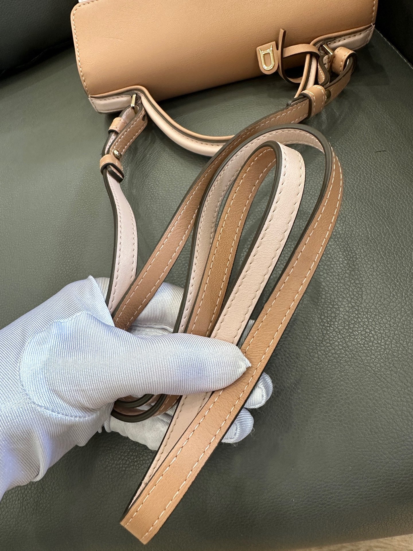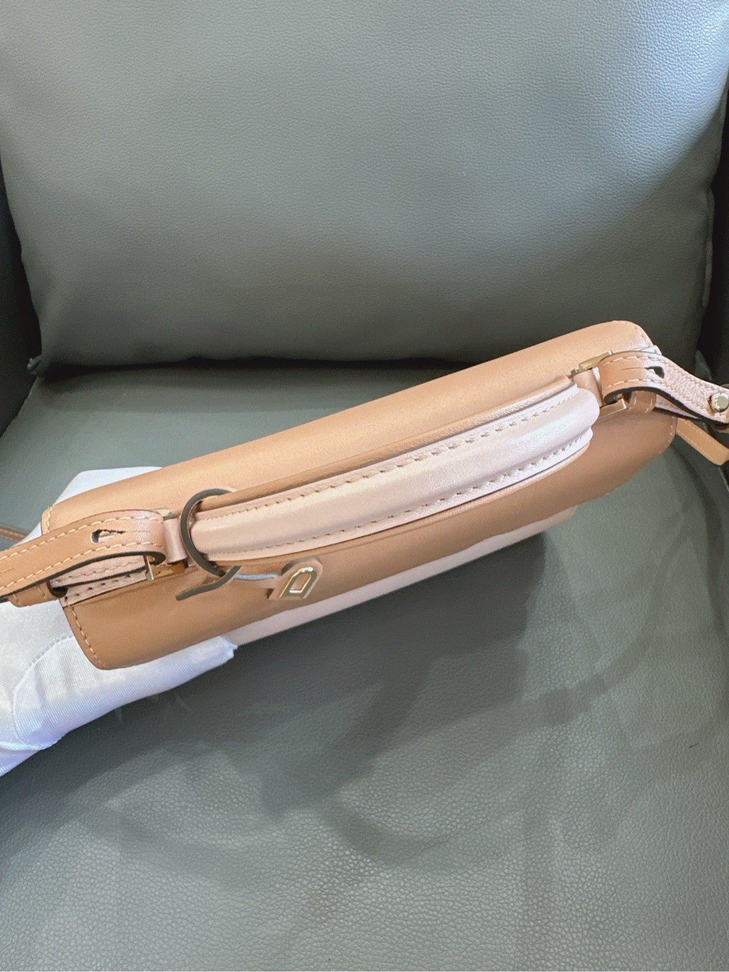 Crafted from exquisite smooth leather, featuring a stylish two-tone design with a light tan hue on the top flap and handle, complemented by a soft pink tone on the main body. The bag boasts the iconic Tempête silhouette, a structured top handle, and a detachable, adjustable leather shoulder strap for versatile carrying options. The distinctive metallic bar with prominent studs defines the front closure, adding a touch of sophisticated edge. Four protective metallic feet adorn the base.