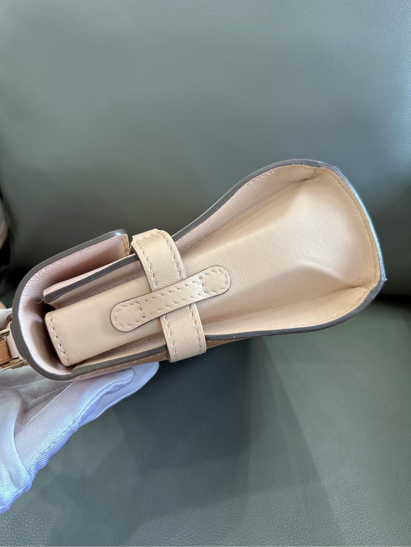 This Delvaux Tempête Mini handbag is in excellent, near-new condition. The two-tone leather exterior shows virtually no signs of wear, maintaining its pristine structure and soft feel. All hardware is bright and shiny with no visible scratches or tarnishing. The interior is immaculate and clean. The protective feet on the base are also in excellent condition, showing no scuffs. Overall, the bag appears to have been very gently used, if at all.