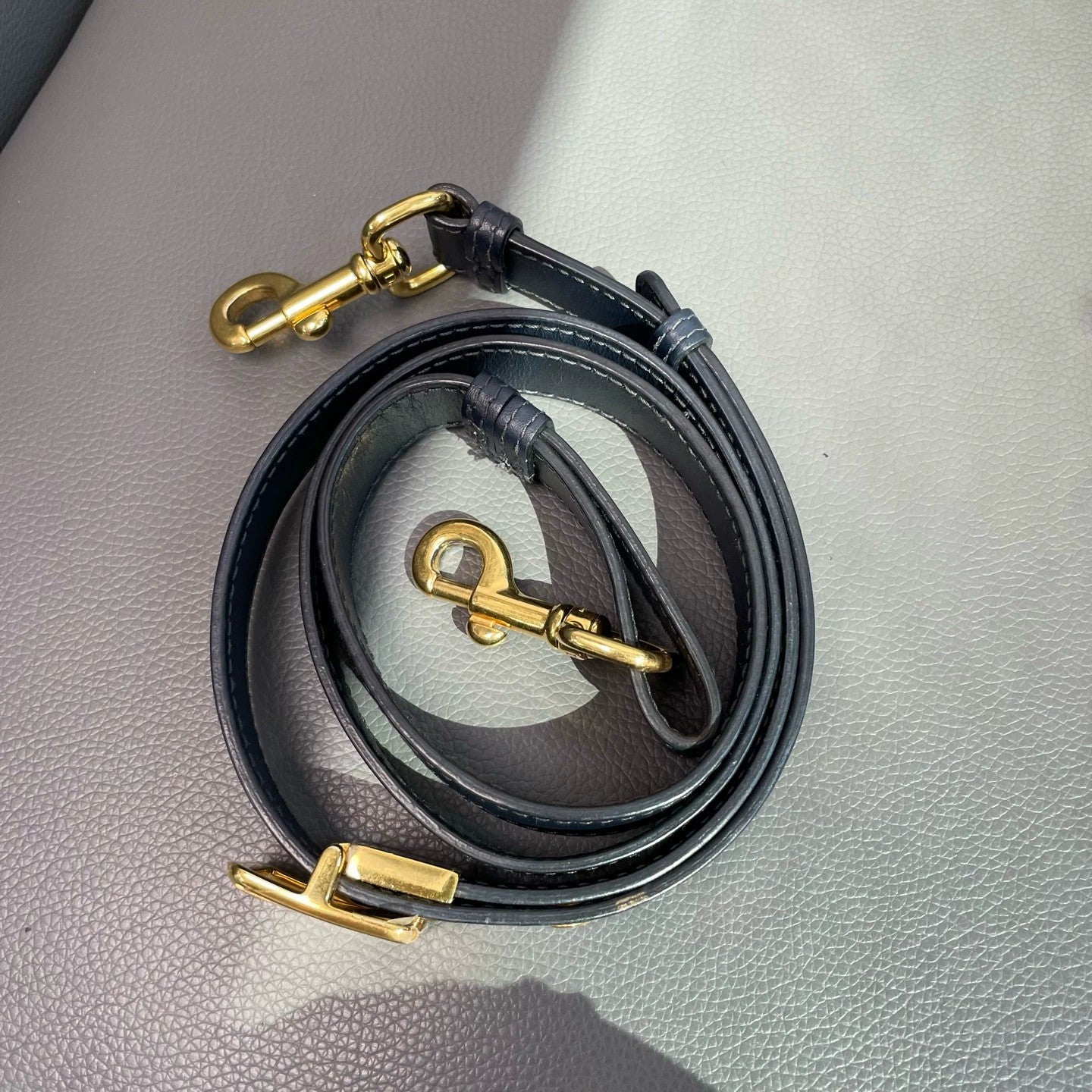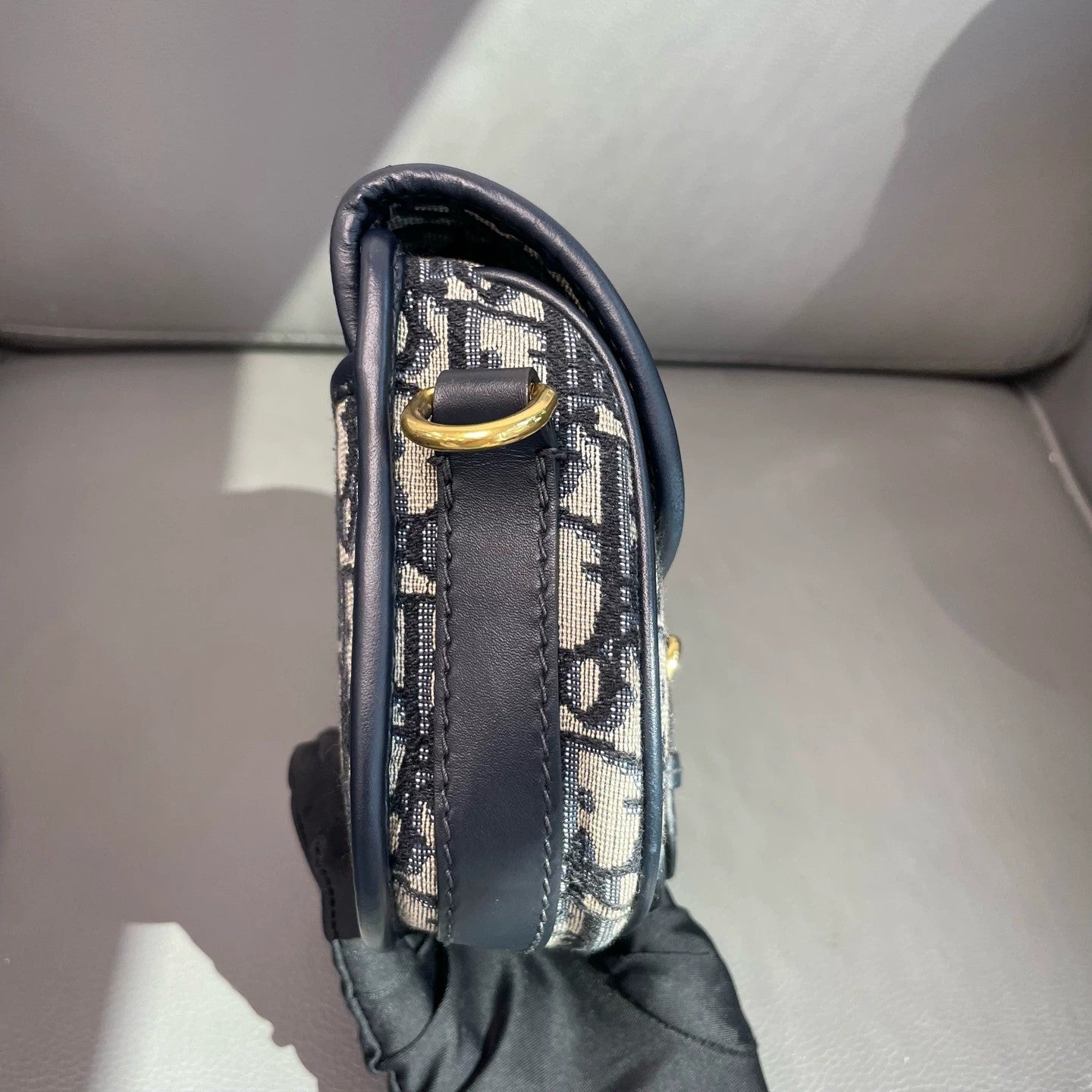 This Dior Bobby Small bag from 2020 is in very good pre-owned condition with only slight signs of use. The iconic Dior Oblique jacquard canvas remains vibrant and clean. The navy blue calfskin leather trim and piping show minimal wear. The gold-tone hardware, including the signature 'CD' buckle, is bright with only minor superficial scratches consistent with gentle handling. The interior is clean, suggesting careful use. Overall, the bag maintains its original structure and aesthetic appeal.