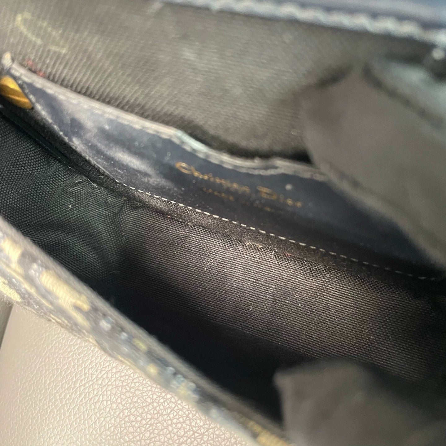 The interior is lined with a dark fabric, likely matching the navy accents. It features a main compartment with a slip pocket, providing practical storage. The 'Christian Dior' signature is visible on an interior leather tab. The lining appears clean with no major stains or damage.