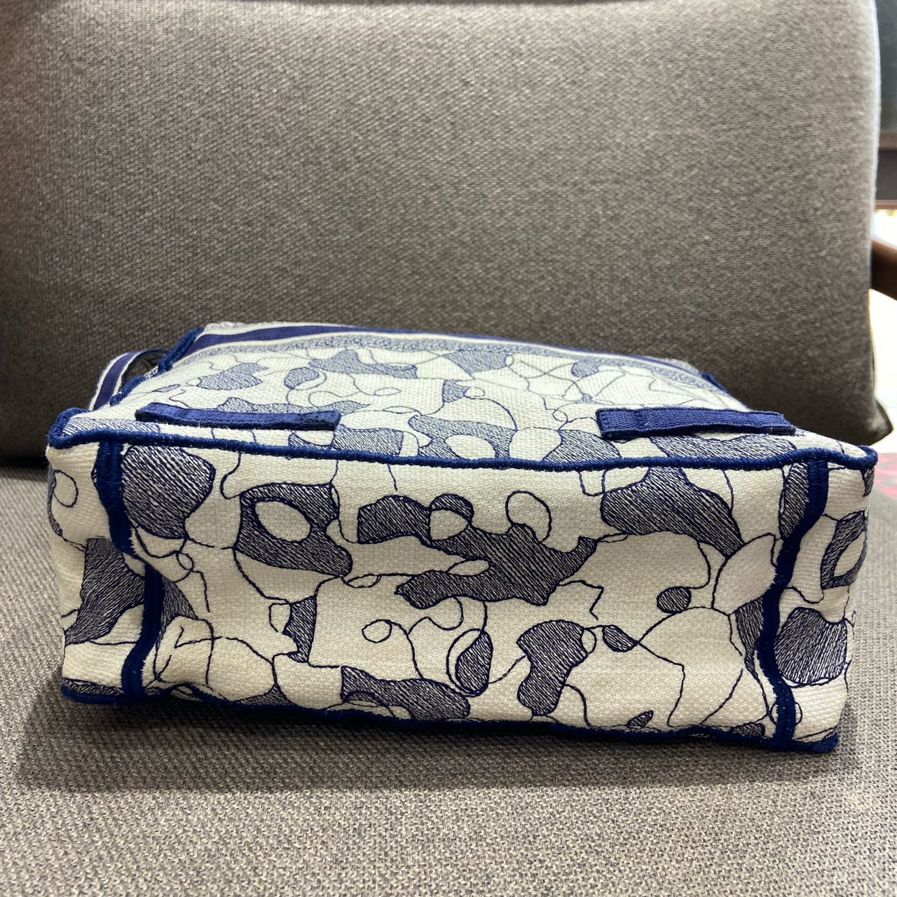 The interior is lined with a coordinating blue and white embroidered canvas, echoing the external pattern. It features a spacious main compartment that is notably clean and well-maintained, free from any visible stains, marks, or foreign objects. There are no additional internal pockets visible, suggesting a streamlined and open design for easy access to belongings.