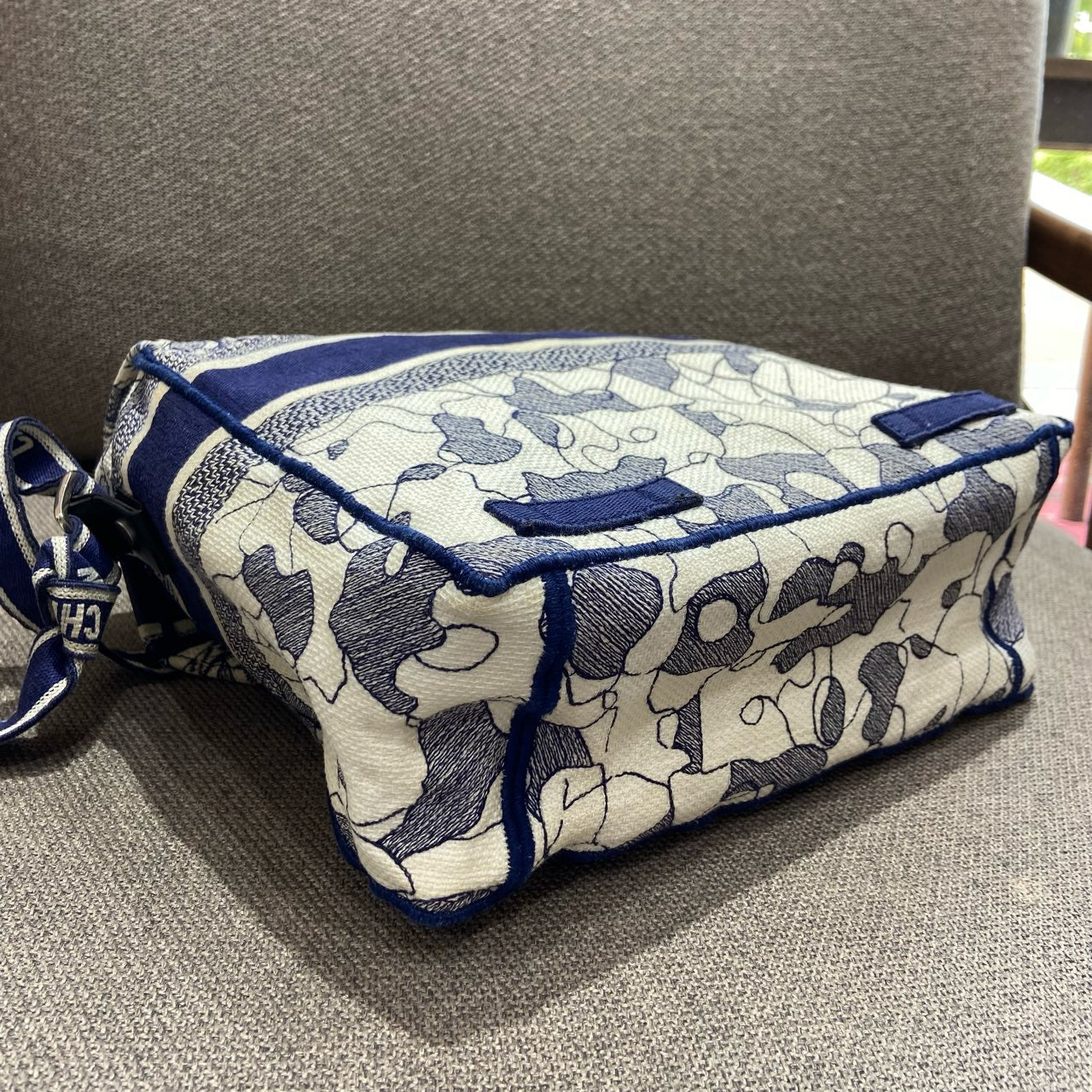 This Dior Camp messenger bag, part of the World Map Limited Edition, is in near-pristine condition, described as '99% new'. The intricately embroidered canvas exterior shows virtually no signs of wear, retaining its vibrant blue and white hues. The structured yet pliable form is well-preserved. The adjustable shoulder strap, emblazoned with 'CHRISTIAN DIOR' branding, is also in excellent shape, showing no fraying or discoloration. All hardware components appear bright and unblemished, with no visible tarnishing or significant scratches. The interior is clean, free from any discernible marks, stains, or odors.