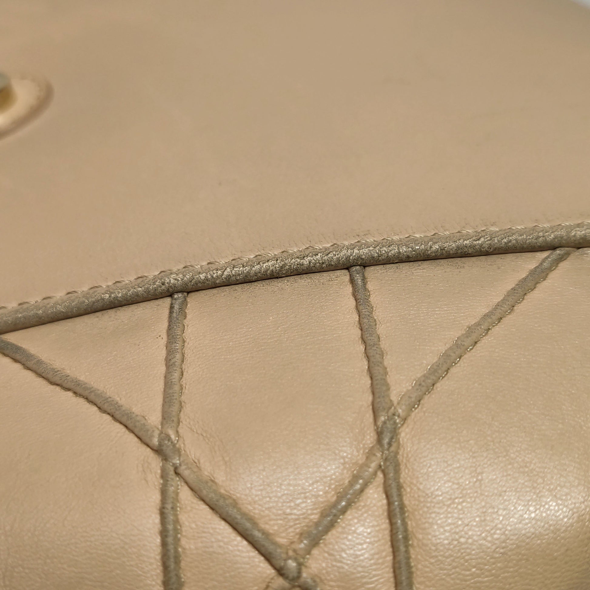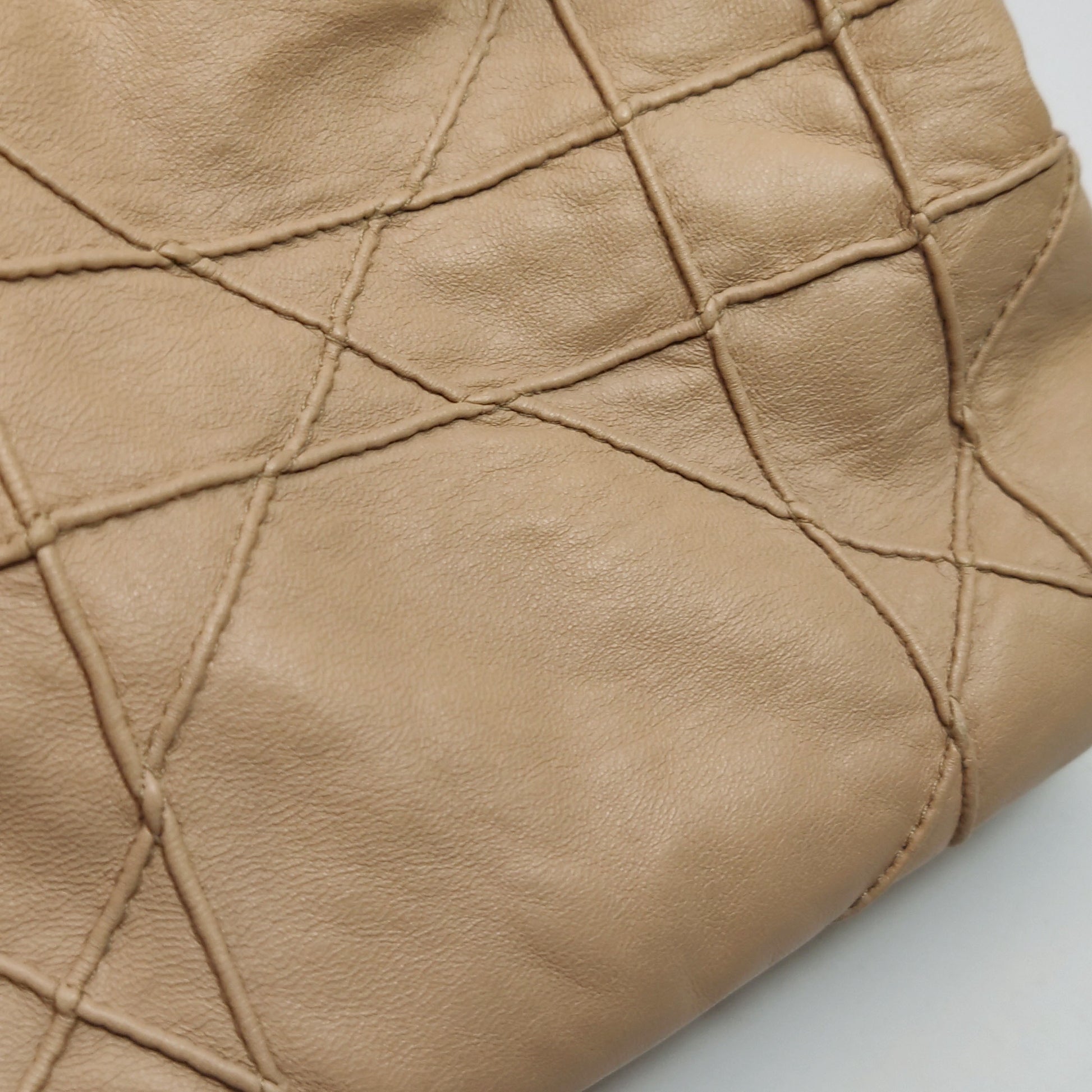 This Dior Toujours bag, crafted from supple beige cowhide leather with the iconic Cannage quilting, is in good pre-owned condition. The exterior shows general signs of use, including some minor surface scuffs and slight darkening or discoloration along the top edges and drawstring area, consistent with regular wear. The handles also exhibit some light darkening from handling. The structure of the bag is somewhat relaxed, characteristic of its soft leather and drawstring design. The bottom corners and protective feet show minimal wear. The light gold-tone hardware remains mostly bright, with minor surface scratches. The interior lining is generally clean with some slight signs of use.