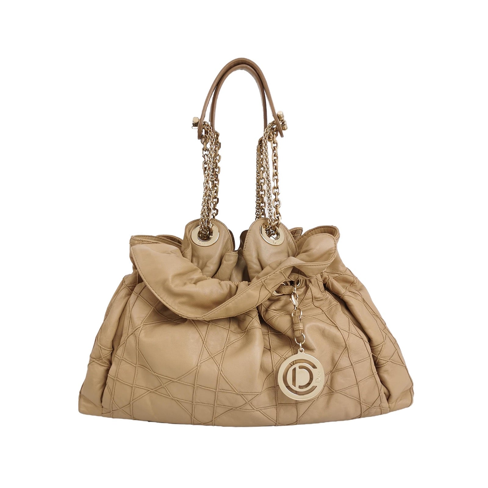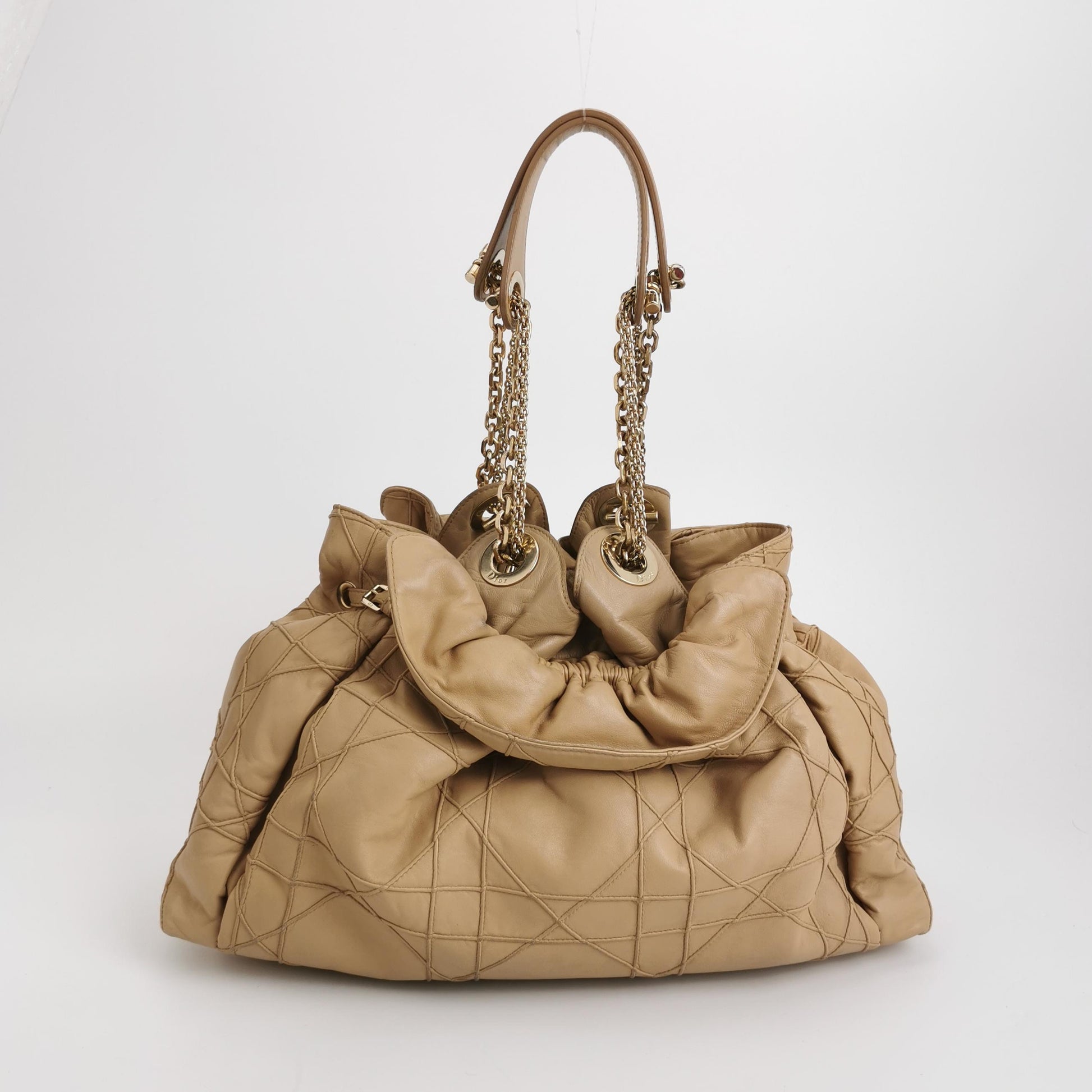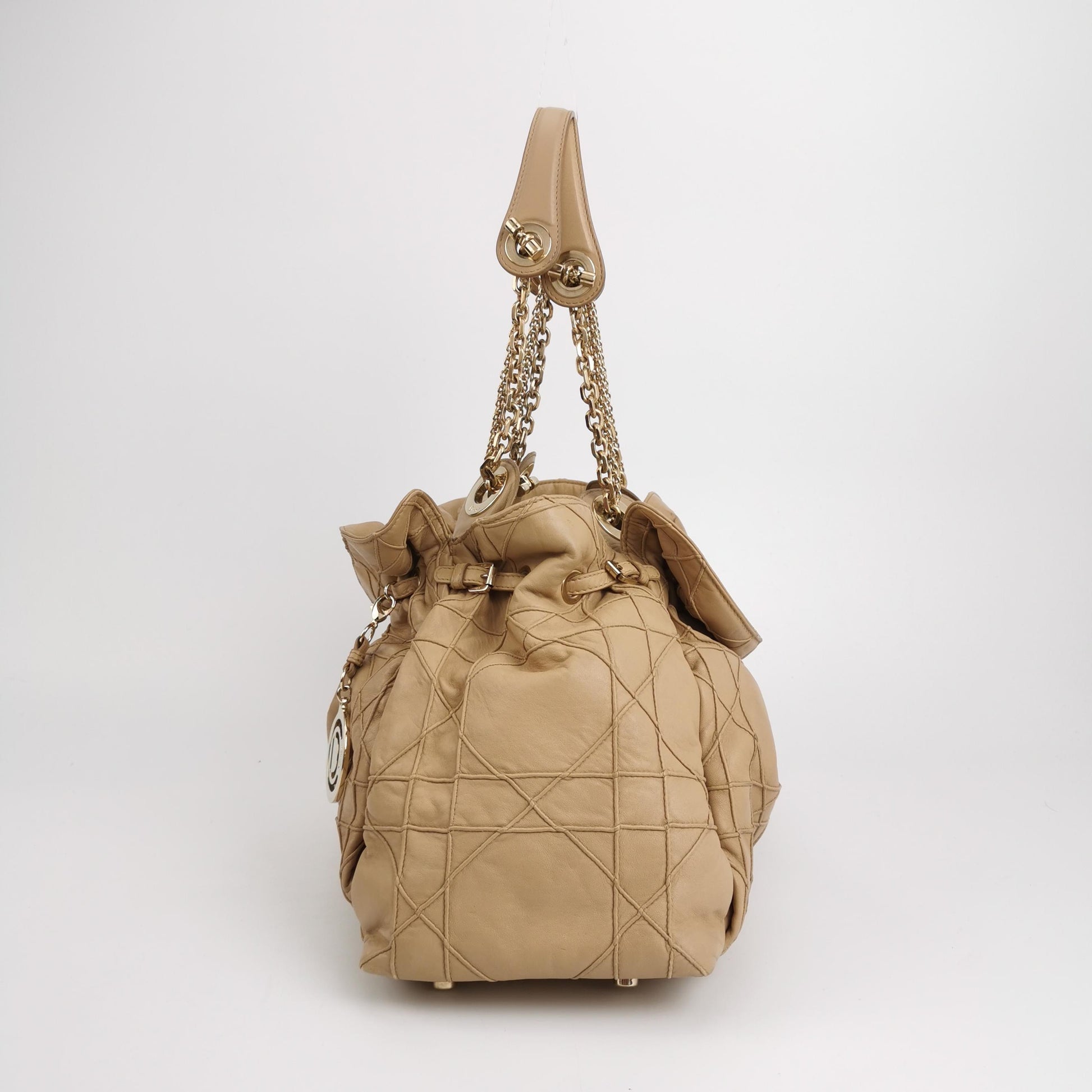 The bag is constructed from luxurious beige cowhide leather, featuring Dior's signature Cannage quilting that creates a geometric pattern across its soft, slouchy silhouette. It includes a functional drawstring closure at the top, allowing for an adjustable opening. The leather top handles provide comfortable carrying, complemented by elegant chain straps that add a touch of sophistication.