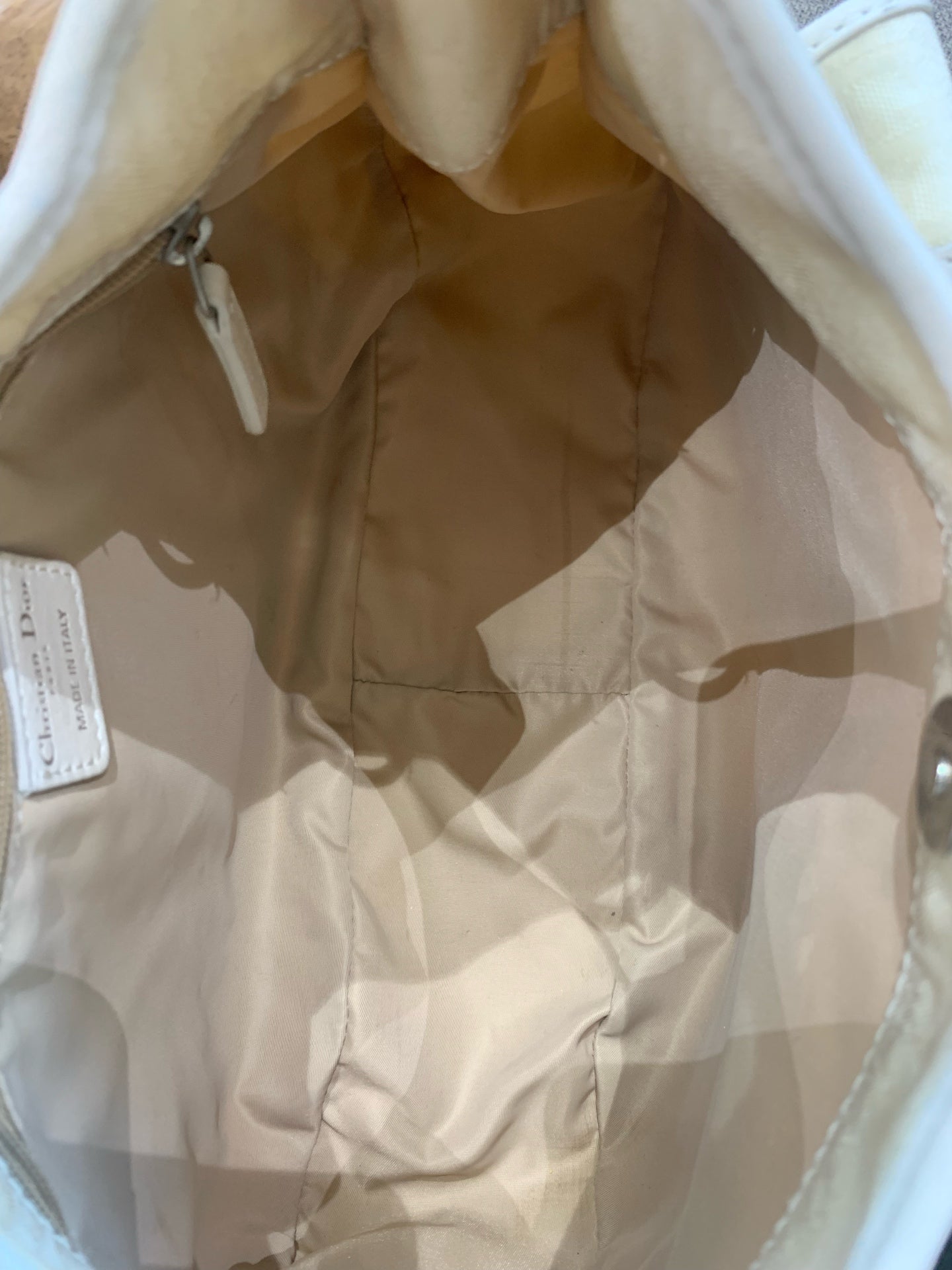 The interior is lined with a coordinating light beige textile fabric. It features a main compartment with a practical zipped pocket for securing smaller essentials. An authentic 'Christian Dior Made In Italy' leather tag with the date code is stitched inside.