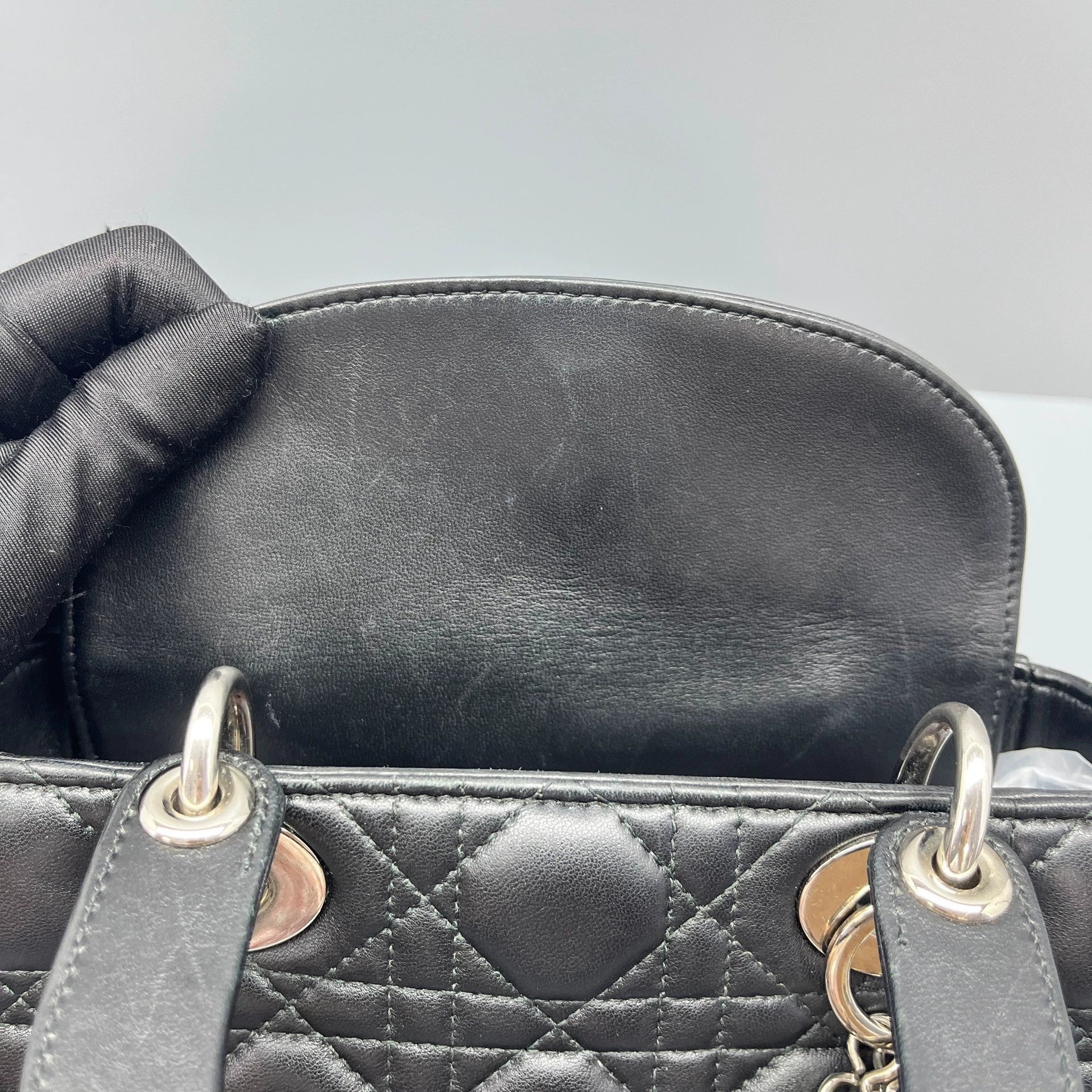 This Dior Lady Dior bag is in excellent pre-owned condition, rated at 97%, indicating very minimal signs of wear. The exterior lambskin maintains its supple texture and structured shape, with the iconic Cannage quilting remaining plump and well-defined. The silver-tone hardware is bright and shiny, showing only faint hairline scratches consistent with gentle use. The interior is clean with no significant marks. The top handles are firm with minimal signs of handling.