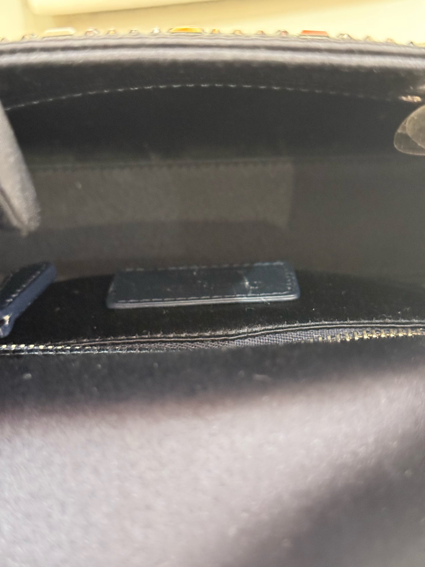 The interior is lined with a coordinating navy fabric, offering a clean and well-kept compartment for essentials. It is free from stains, odors, or any signs of use, consistent with its '99 new' condition.