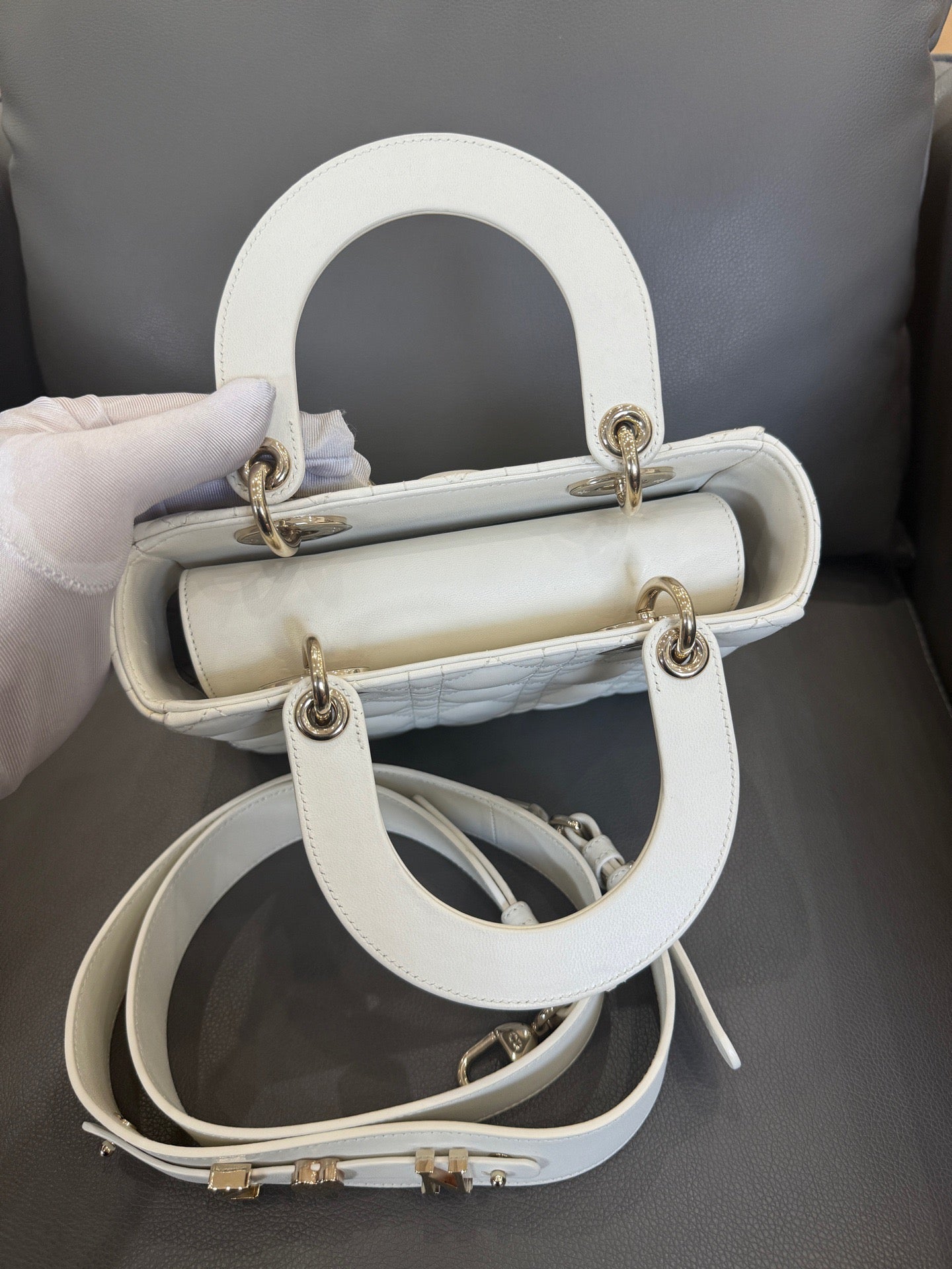 This Dior Lady Dior Small bag is presented in good pre-owned condition, reflecting its original state as described, with careful handling. The iconic cannage-quilted lambskin exterior maintains its structured silhouette and pristine white color, though close inspection reveals minor wear on the bottom corners, including slight scuffing and discoloration. The light gold-tone hardware, including the signature 'DIOR' charms, remains bright with only faint hairline scratches consistent with gentle use. The top handles are firm with minimal signs of wear. The interior lining shows light signs of use but remains clean. The protective feet on the base exhibit minor surface wear.