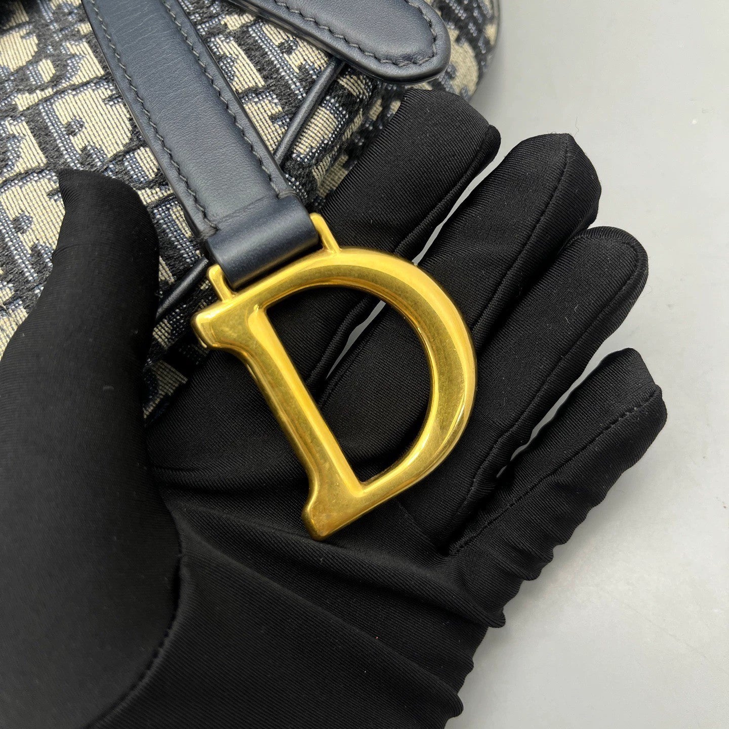 This Dior Saddle bag in iconic Oblique canvas is in excellent pre-owned condition, rated at 97% new. The exterior canvas is vibrant and clean, showing minimal signs of wear with no noticeable fading or scuffs. The navy blue calfskin leather trim and details are well-preserved. The gold-tone hardware, including the 'D' stirrup and 'CD' signature links, retains its shine with only faint hairline scratches consistent with gentle use. The interior is clean and free from significant marks or odors. The bag maintains its structured saddle shape beautifully.