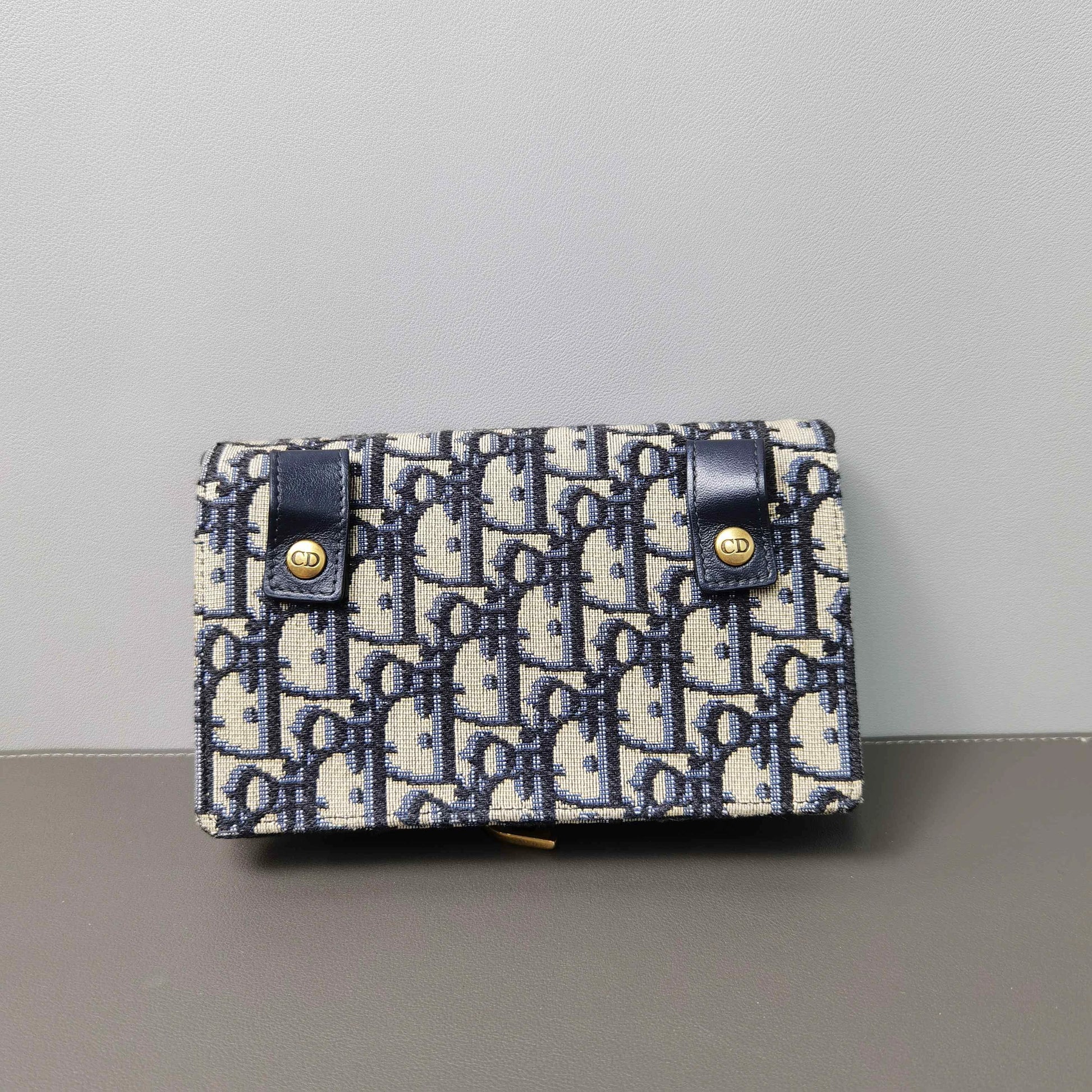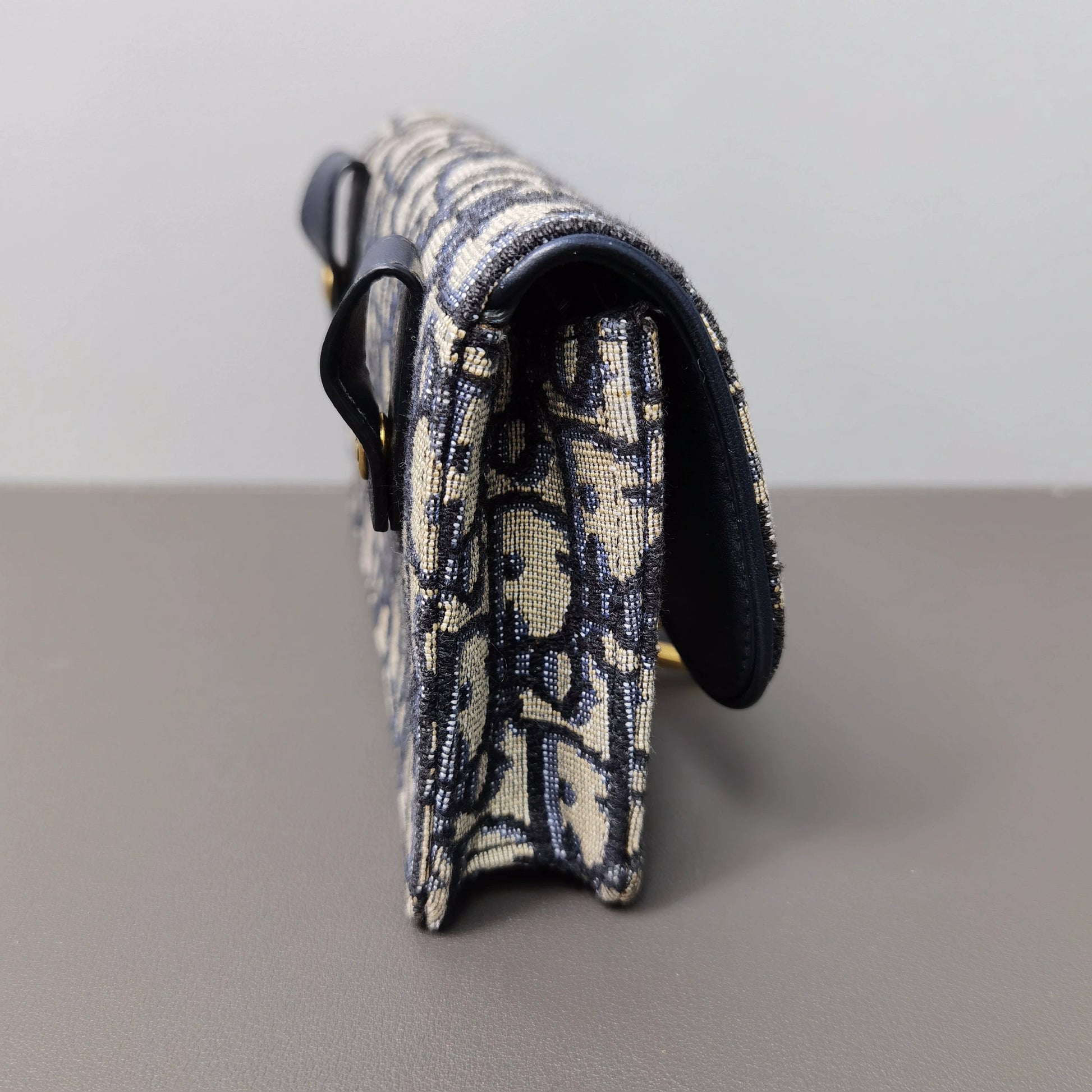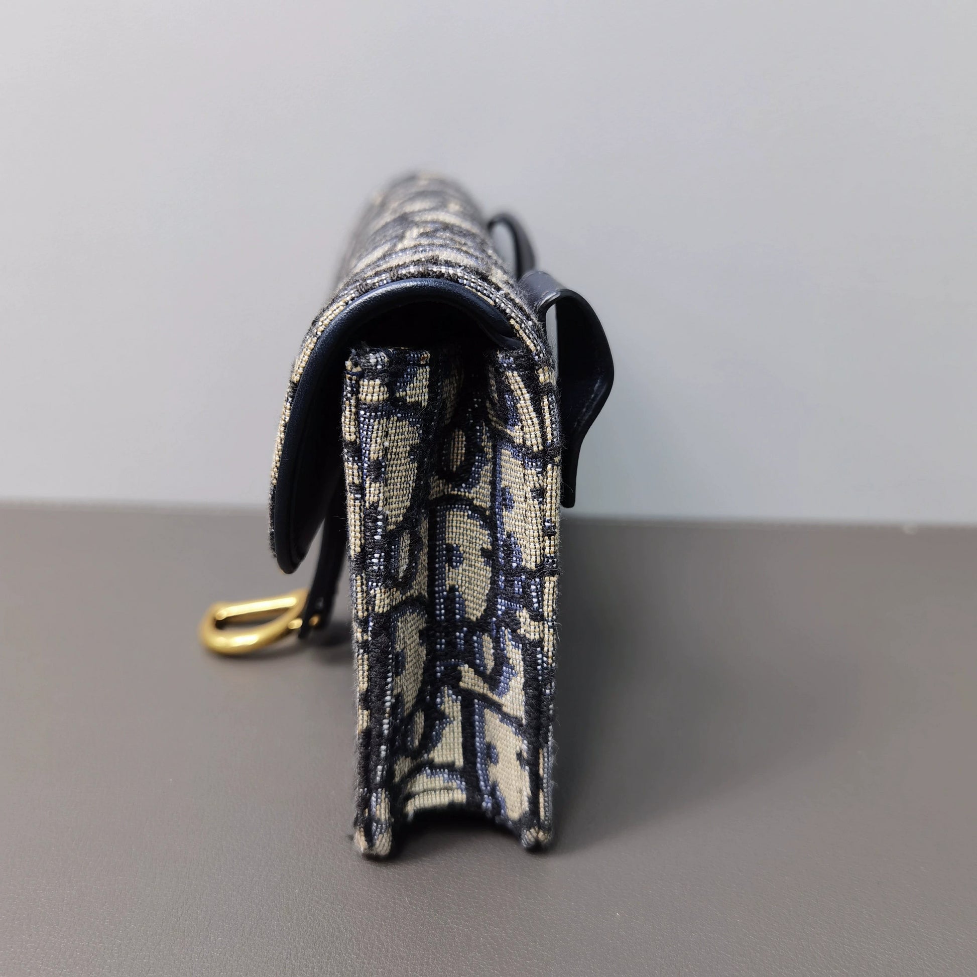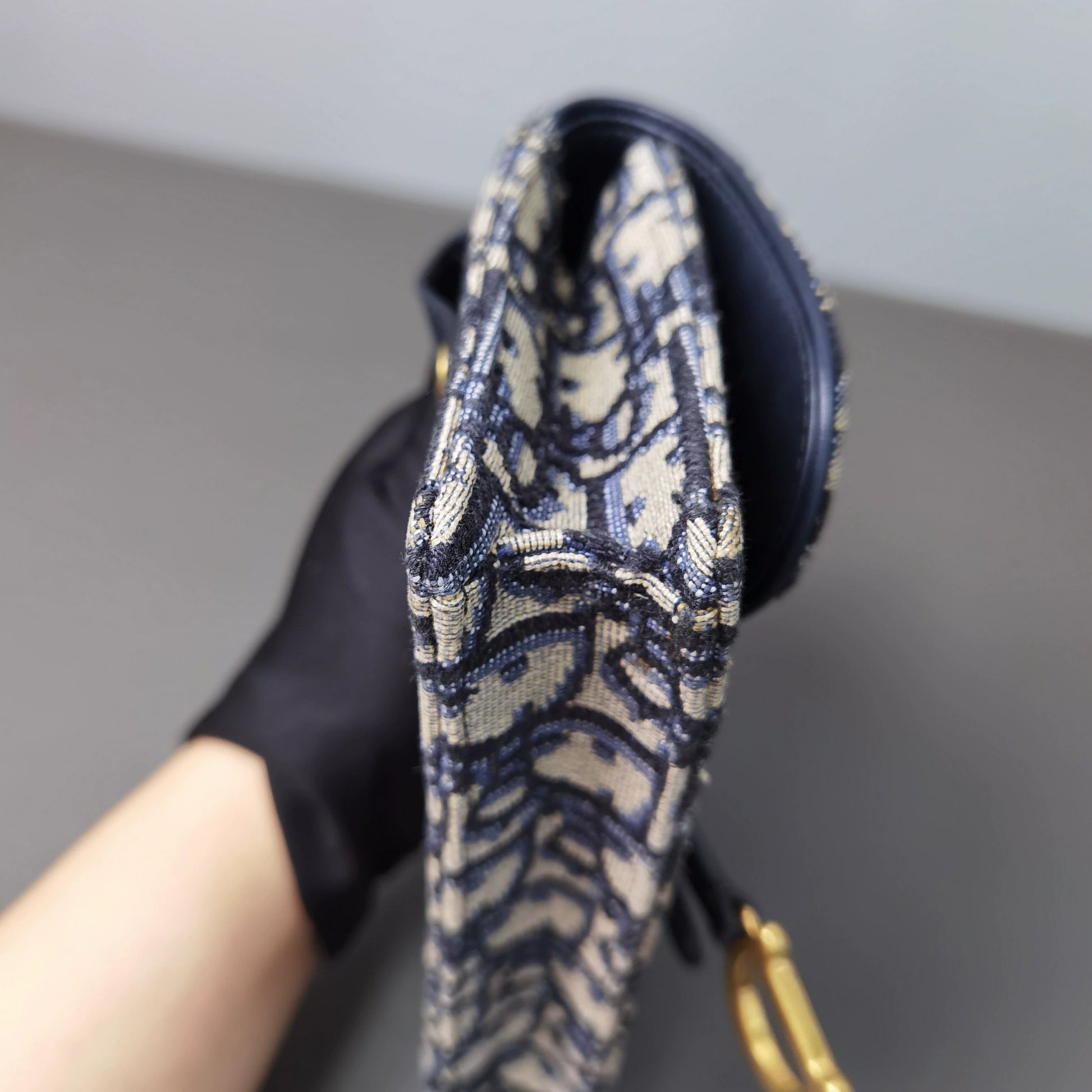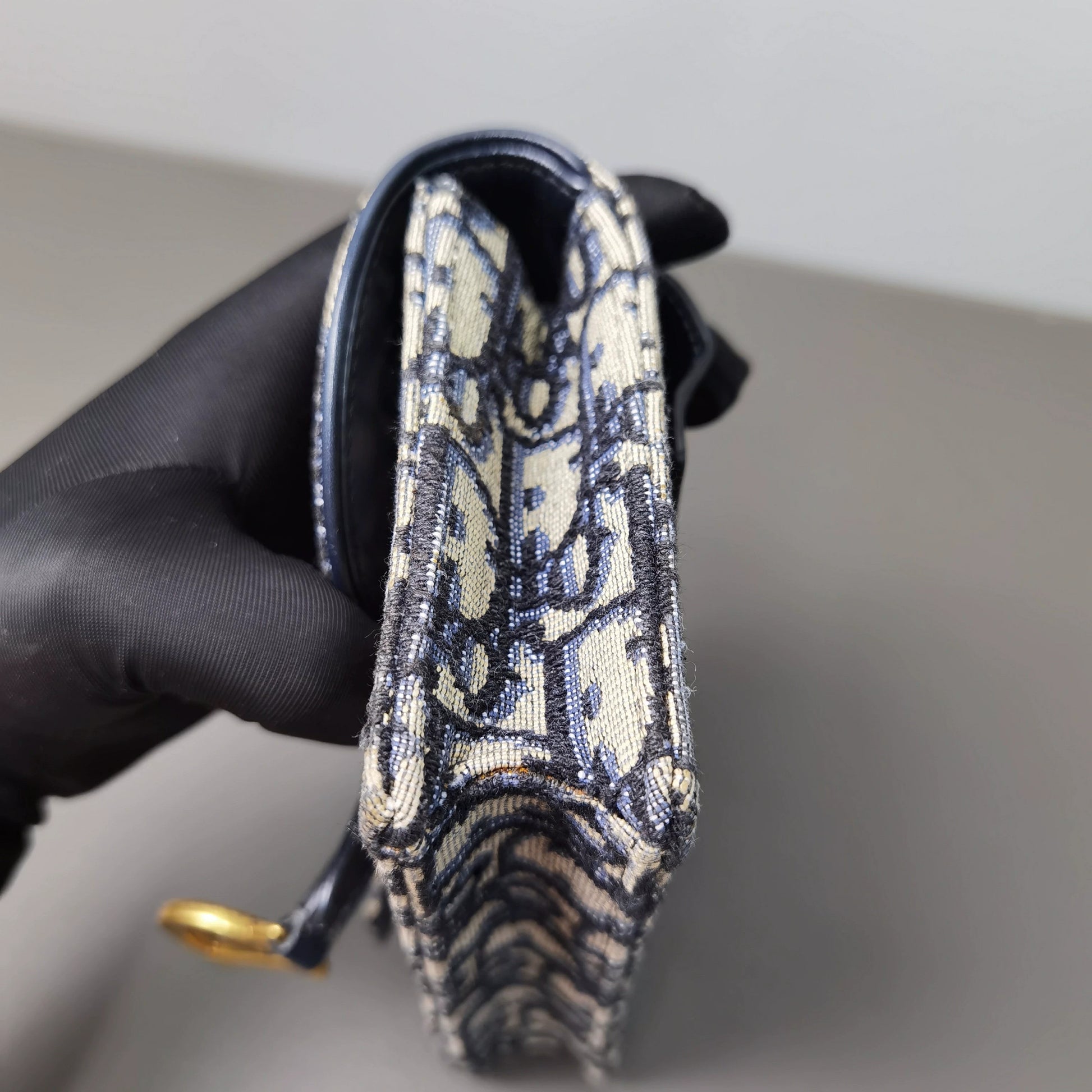 Crafted from Dior's iconic navy blue Oblique jacquard canvas, featuring the distinctive Saddle flap design. The structural integrity of the pouch is well-maintained, with crisp edges and a clear pattern definition. The back features two leather tabs with 'CD' embossed snap buttons for attaching the strap, allowing for versatile wear.