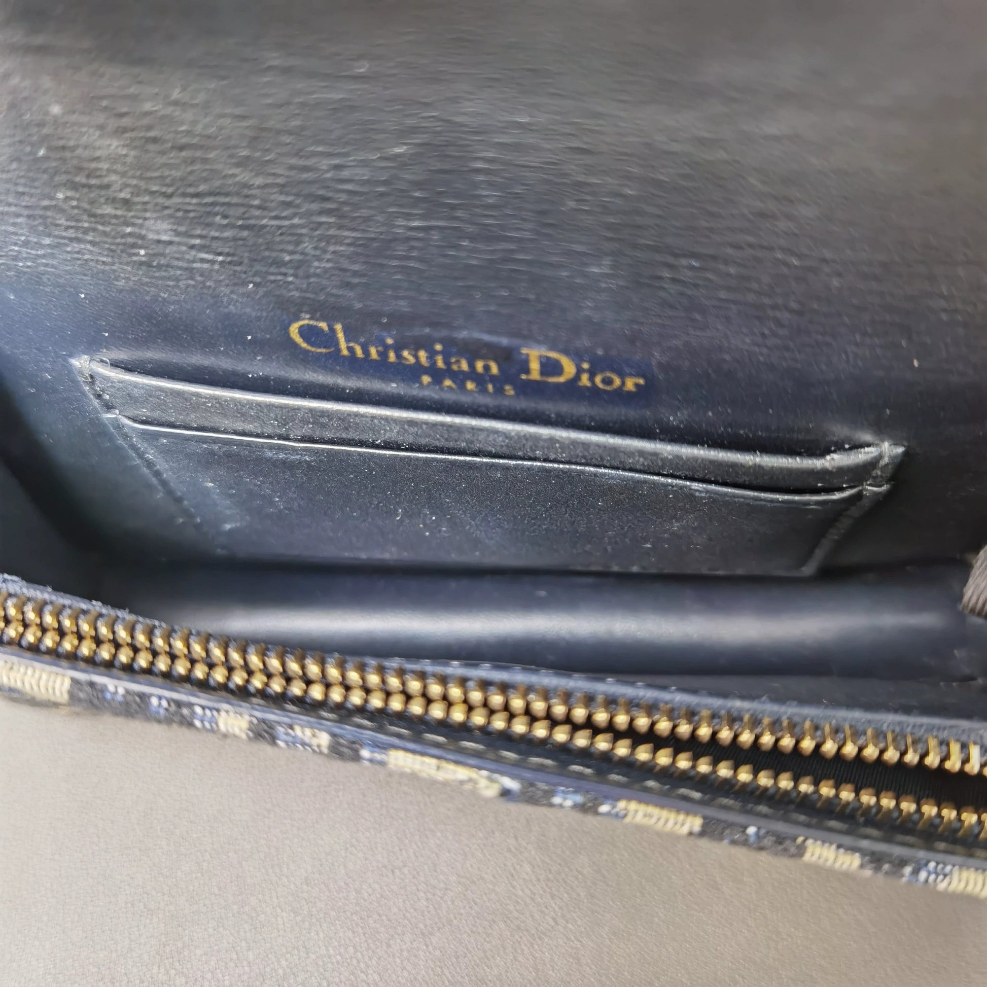 The interior of the flap is lined with smooth navy leather, which shows minor impressions. The main compartment is lined with a dark textile and includes a flat slip pocket and a zippered compartment, providing practical organization. The 'Christian Dior PARIS' heat stamp is clearly visible inside.