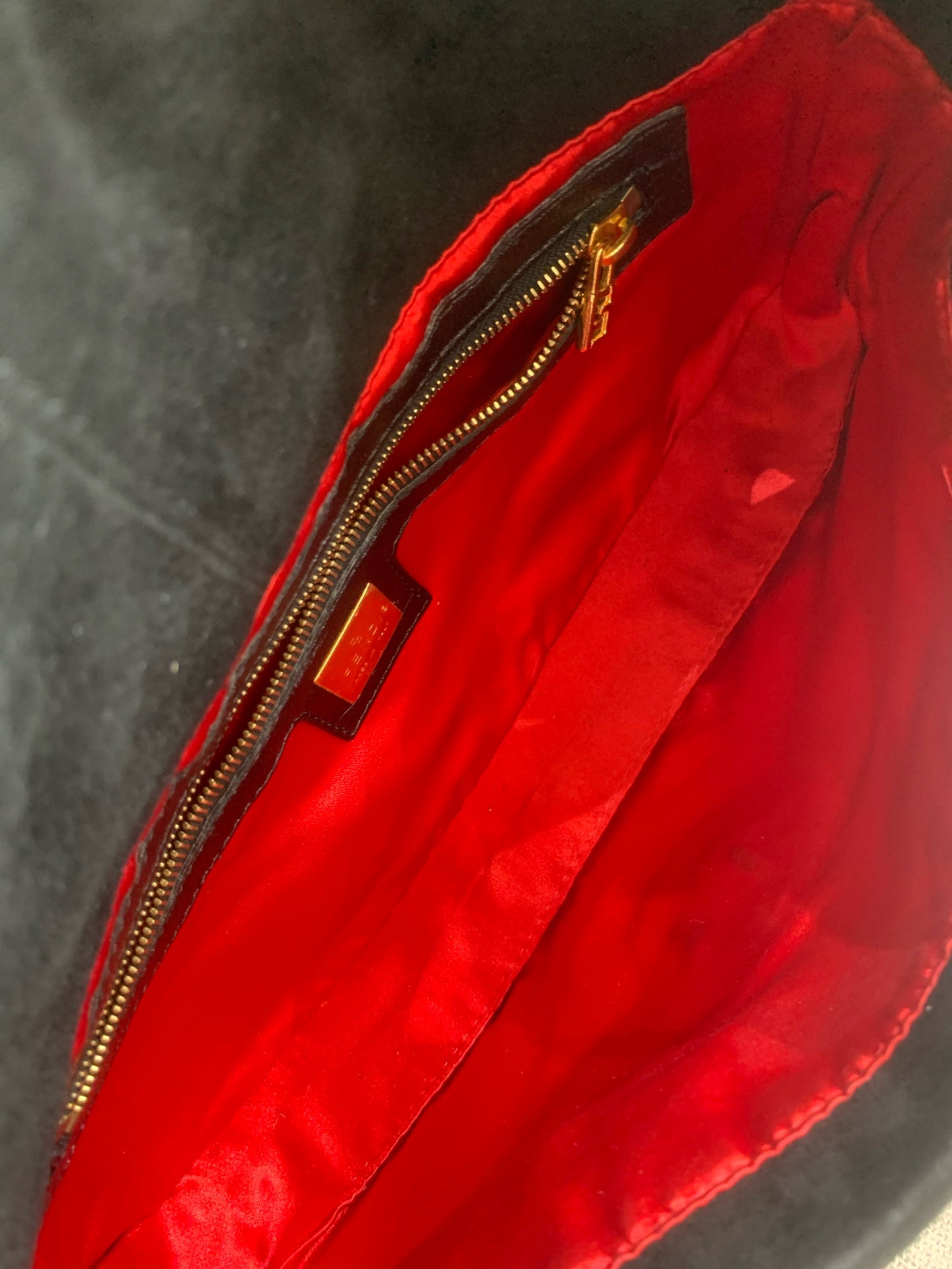 The interior is lined with a vivid red satin fabric, creating a striking contrast with the black exterior. It features one main compartment and a practical zippered pocket, complete with a gold-tone Fendi brand plaque. The lining is clean and appears to be free of stains, tears, or significant signs of use.