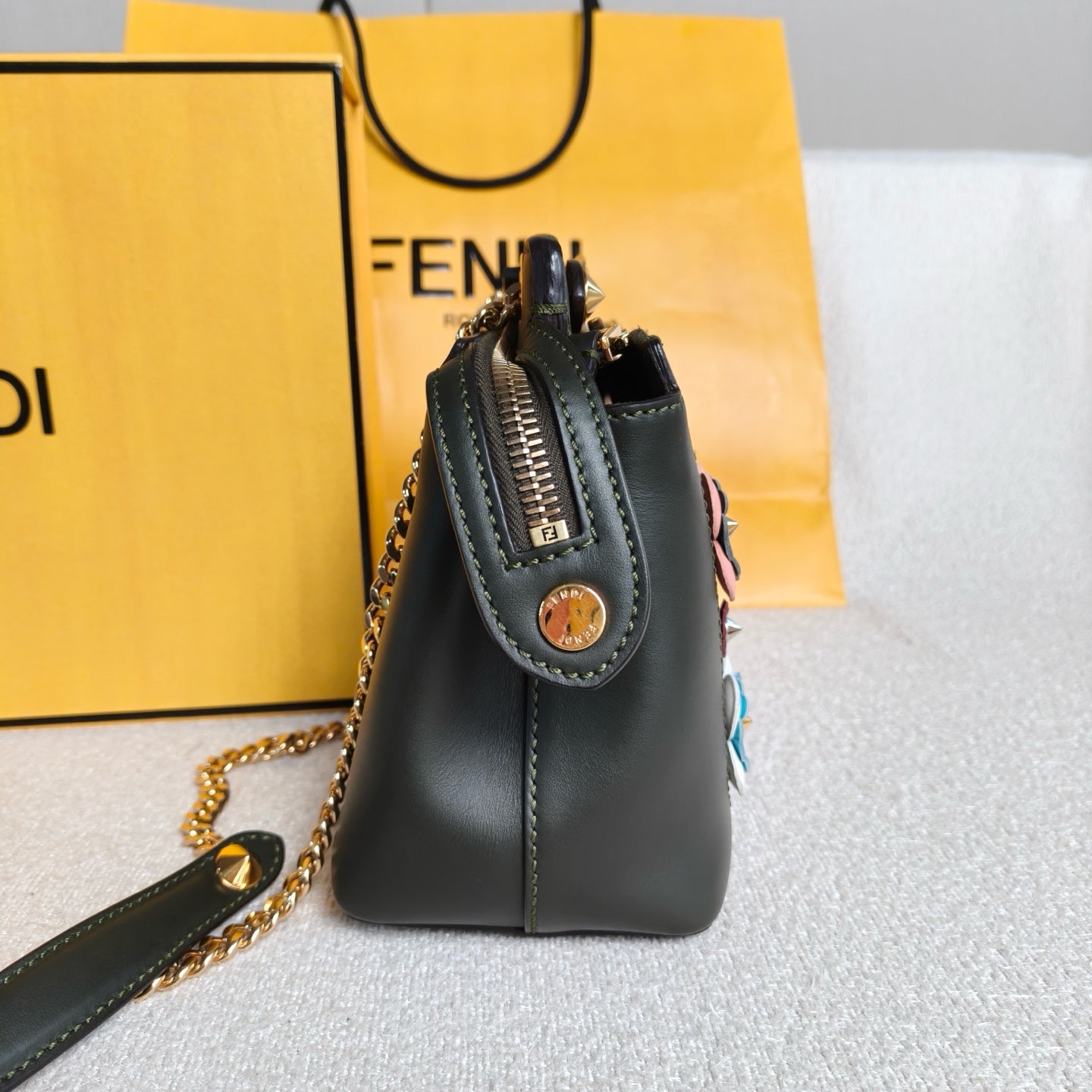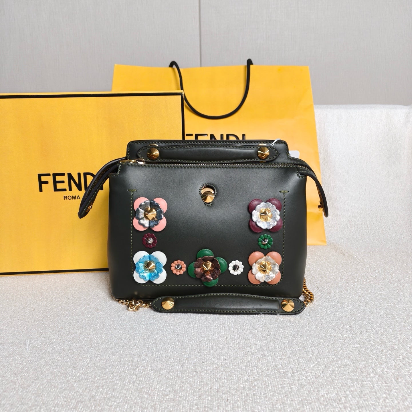 Polished gold-tone hardware is used throughout, including the two top zipper closures, each with a Fendi branded pull. The chain strap is interwoven with matching dark green leather. The pyramid studs on the floral appliqués and the protective base feet are all in excellent, gleaming condition, showing no signs of wear or oxidation.