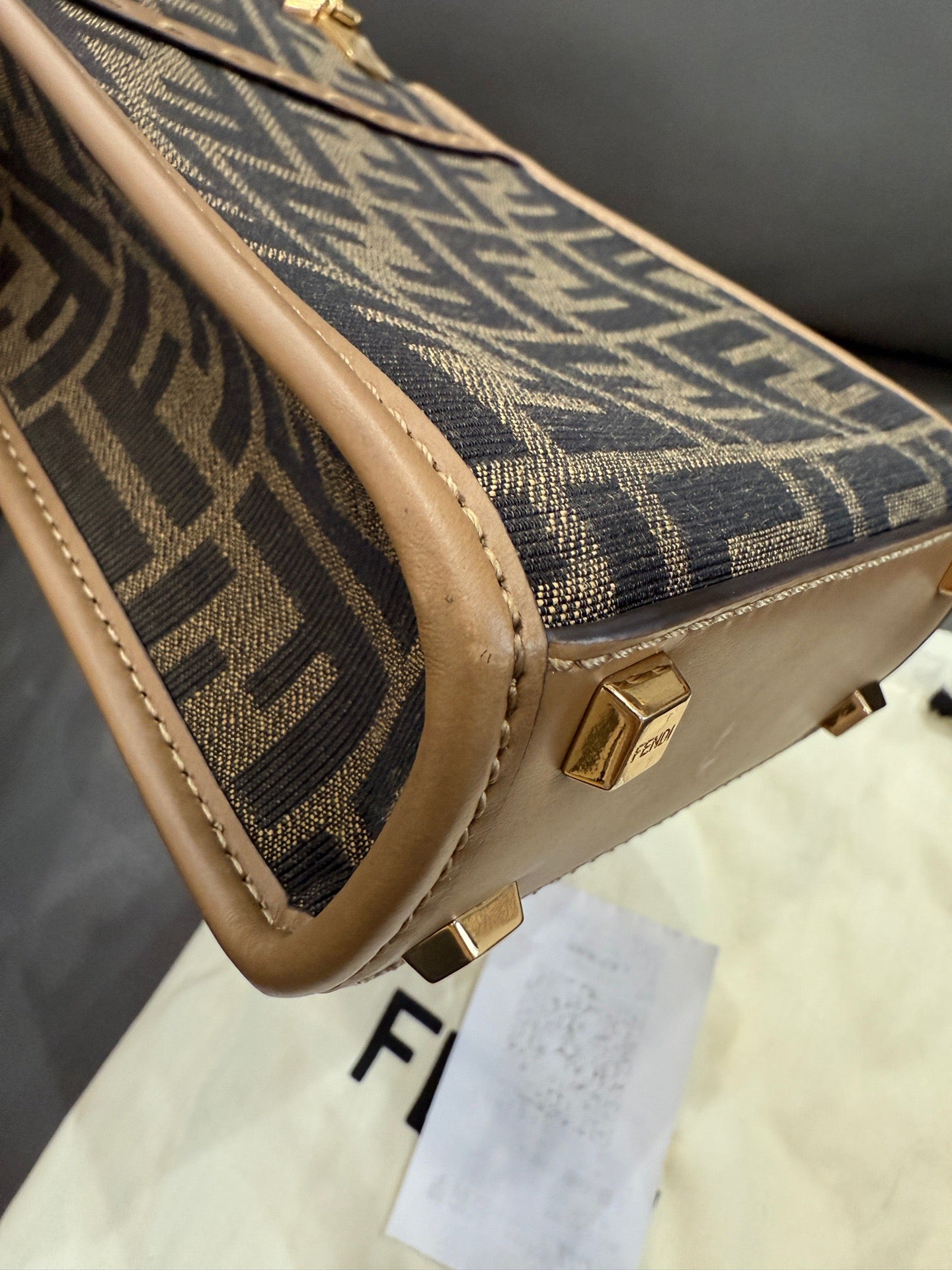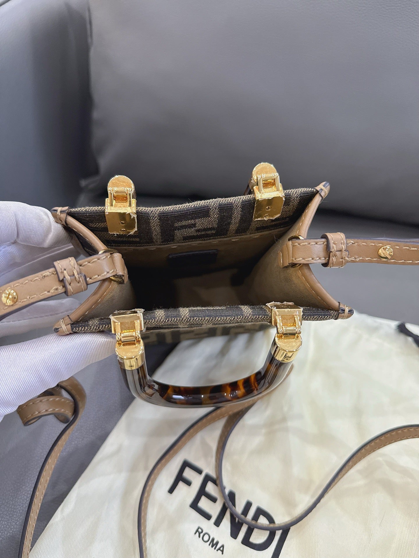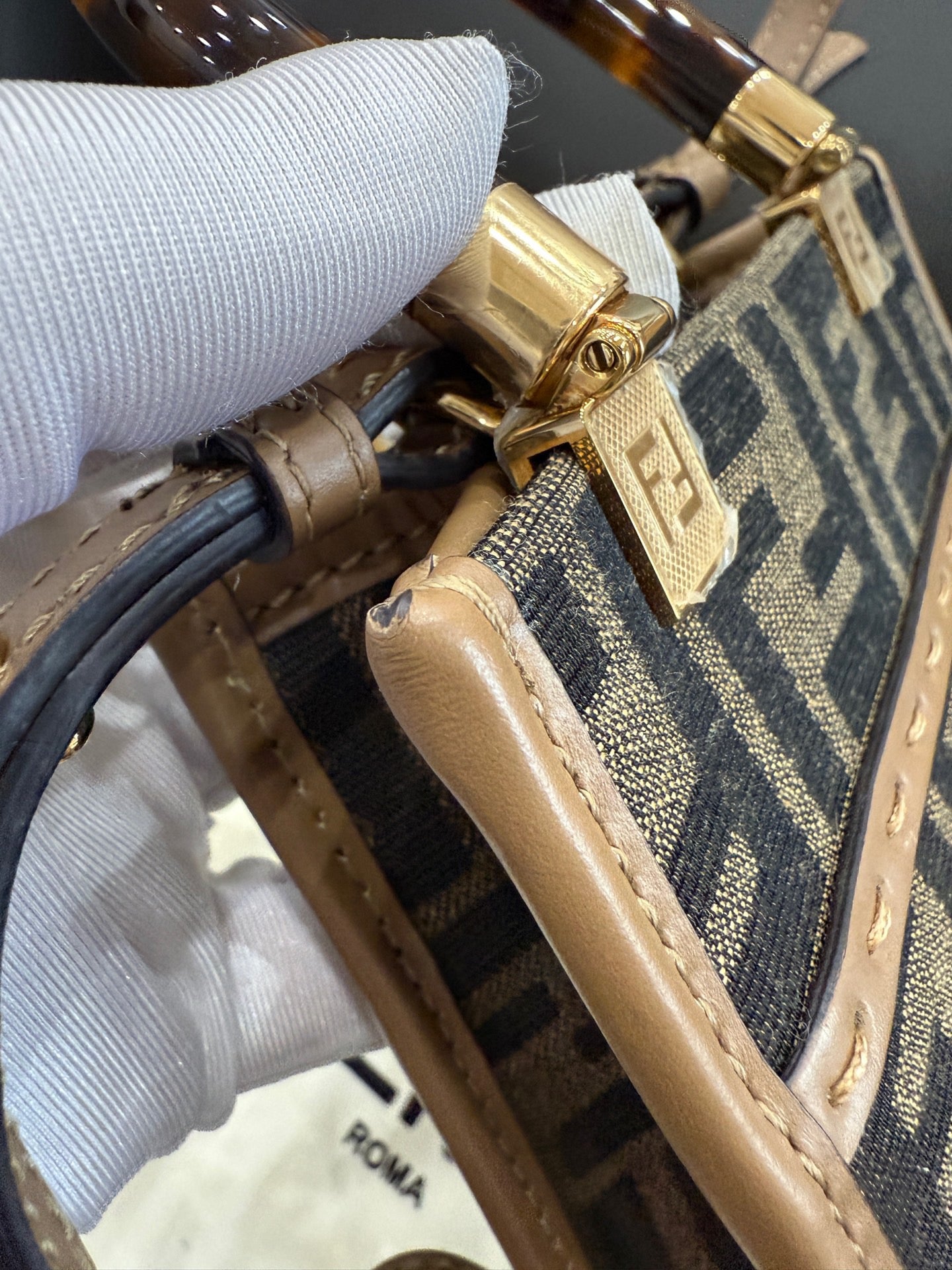 The most distinctive feature of this mini tote is its elegant, rigid top handles crafted from a luxurious tortoiseshell-effect resin, providing a striking contrast to the monogram canvas. The structured design and iconic FF pattern make it a recognizable Fendi piece.