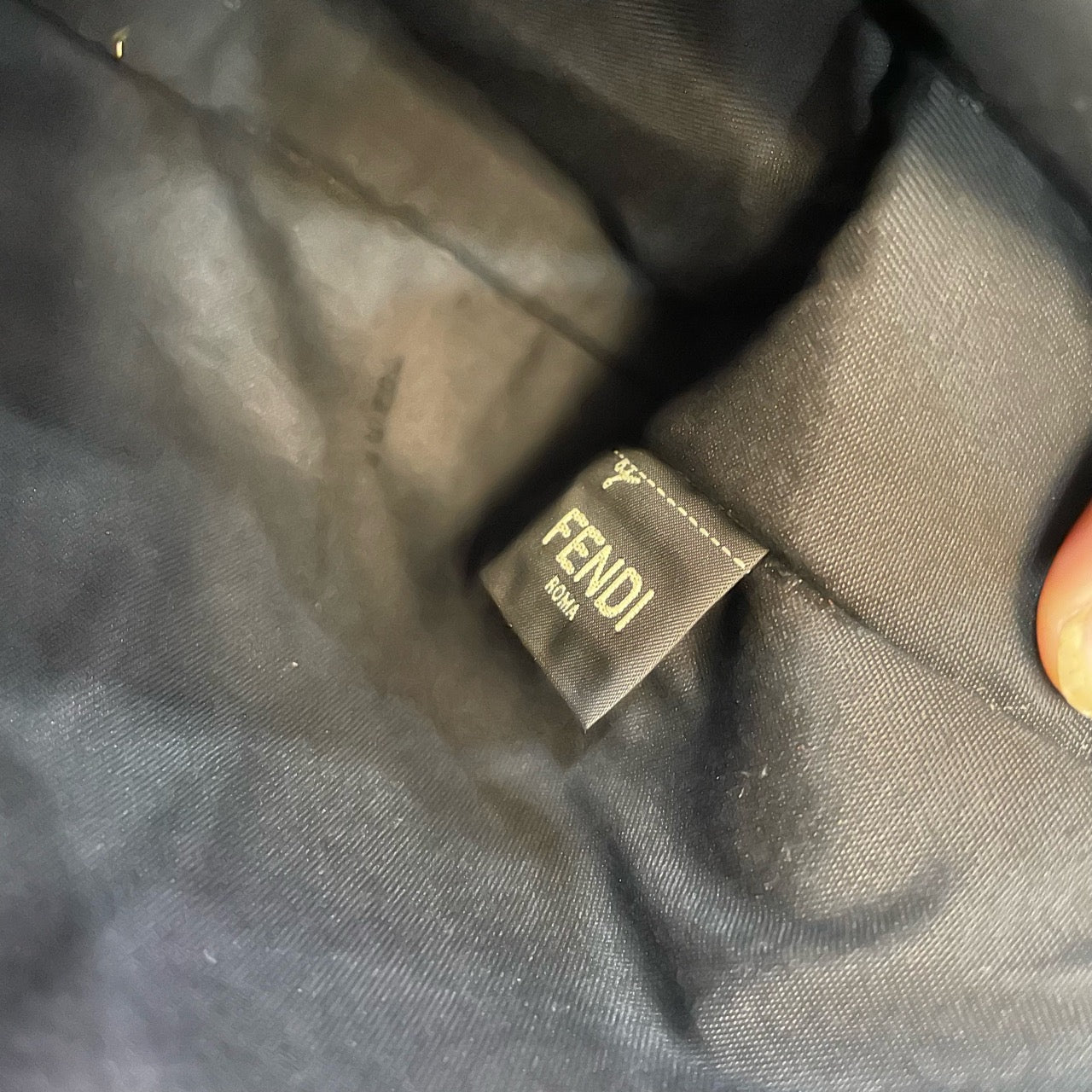 The interior is lined with durable black fabric, presenting a clean and well-maintained appearance. It features a main compartment spacious enough for essentials. A leather tag embossed with 'FENDI MADE IN ITALY' and a fabric tag with 'FENDI ROMA' are present, alongside a discreet tag displaying the product's serial number.