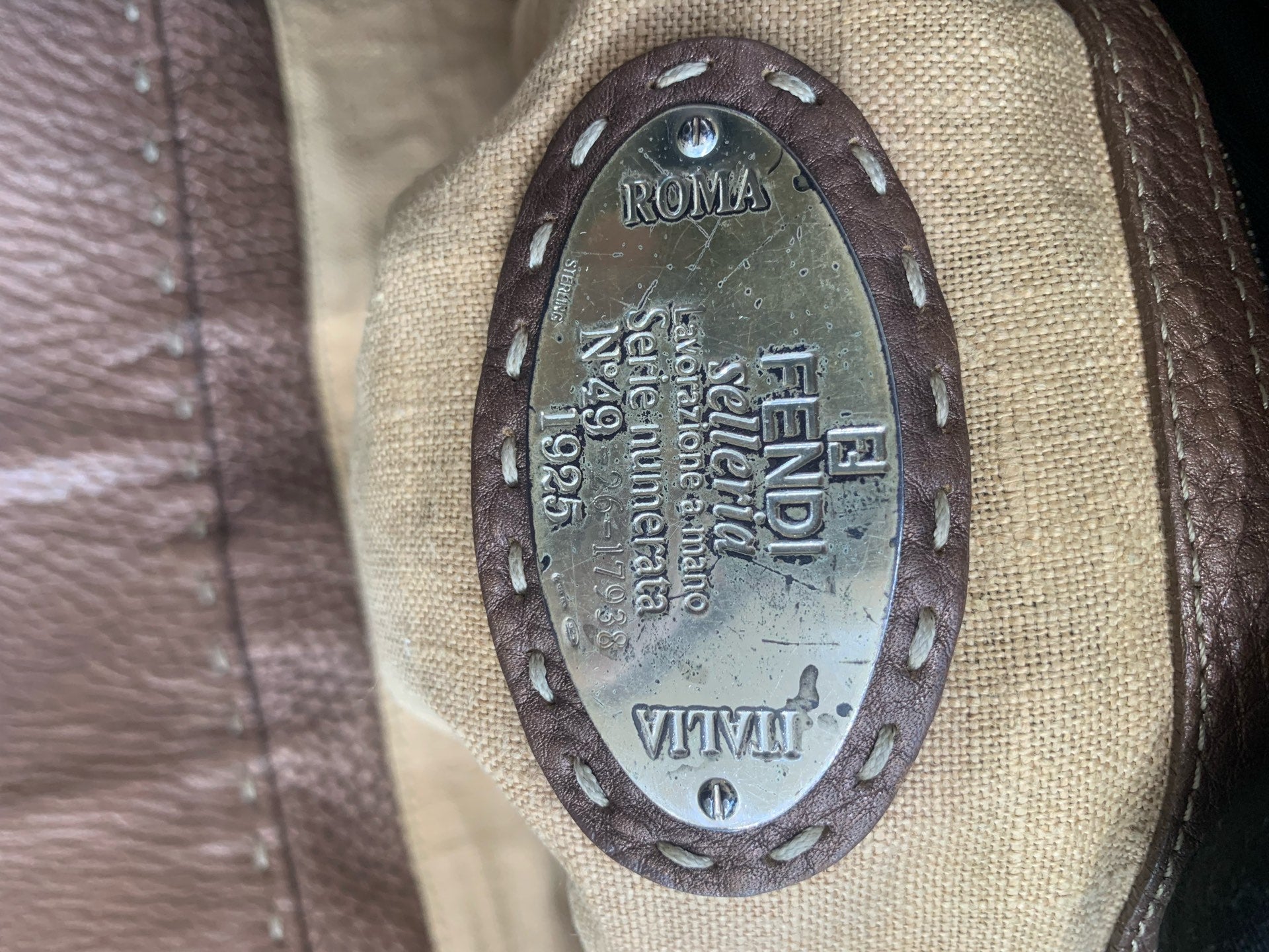 This is a discontinued limited edition Fendi Selleria bag, distinguished by its hand-stitched craftsmanship and the unique embossed equestrian motif, known as the 'War Horse' style. The interior metal plaque indicates 'FENDI Selleria, Lavorazione a mano, Serie numerata N°49 1925, ROMA ITALIA', highlighting its heritage and artisan quality.
