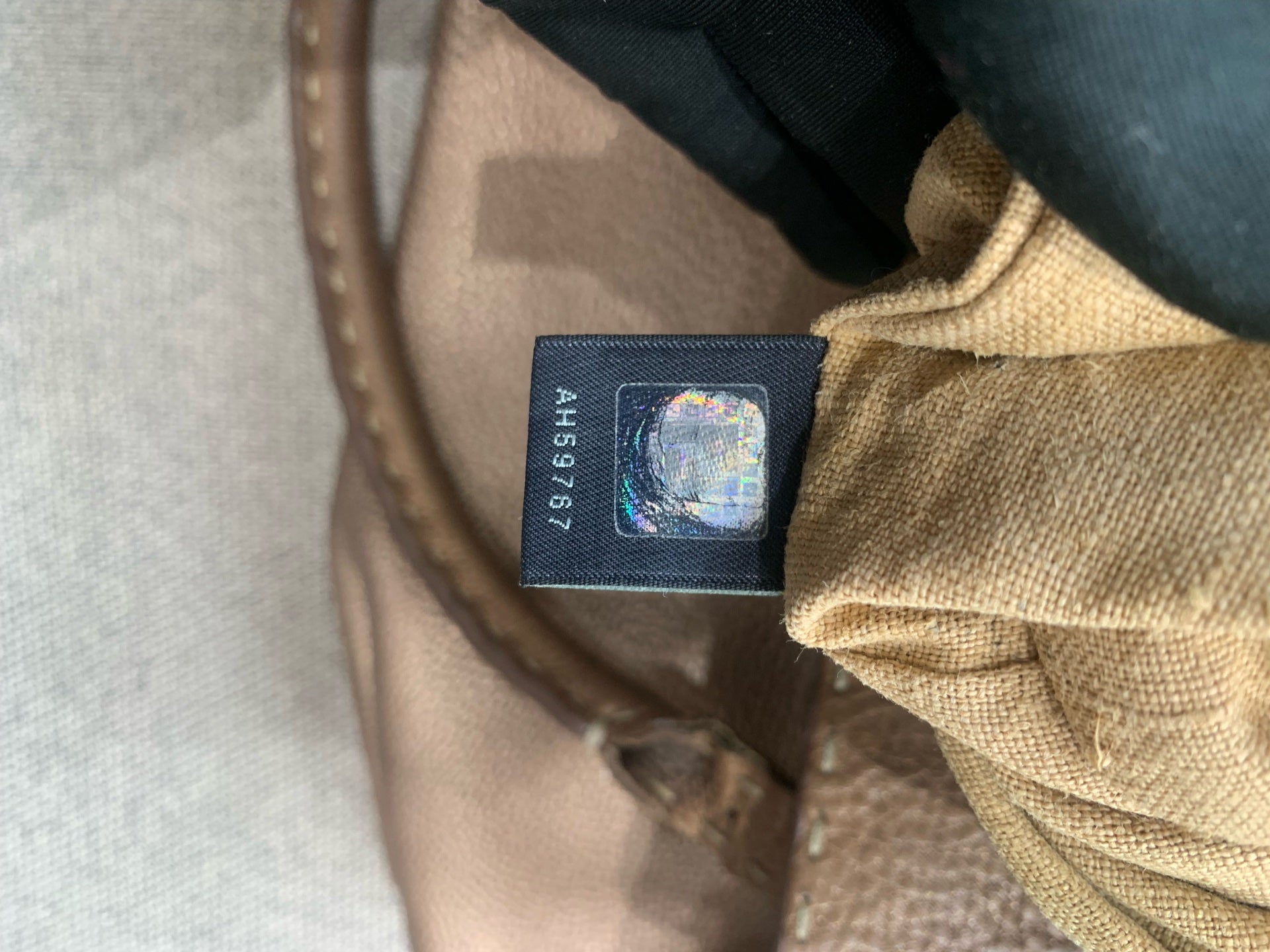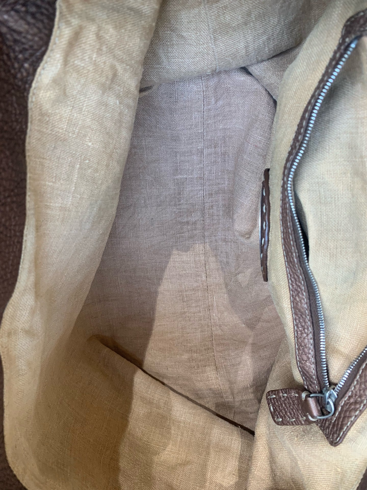 The spacious interior is lined with a natural light beige canvas or linen material, which appears clean and well-maintained. It includes at least one zippered side pocket for securing smaller items. An authenticity tag with a holographic serial number is present inside.