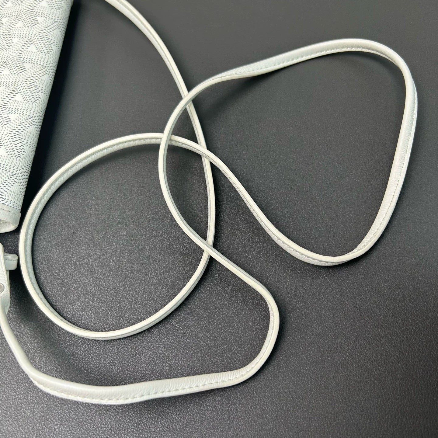 Crafted from Goyard's signature white Goyardine canvas, featuring the hand-painted chevron monogram pattern in grey and black. The bag features clean lines with tonal leather trim on the edges, providing structure and durability. A front flap closure secures the main compartments. The design includes a slender, adjustable leather shoulder strap, allowing for versatile wear as a shoulder bag or crossbody, or removed for use as a clutch.