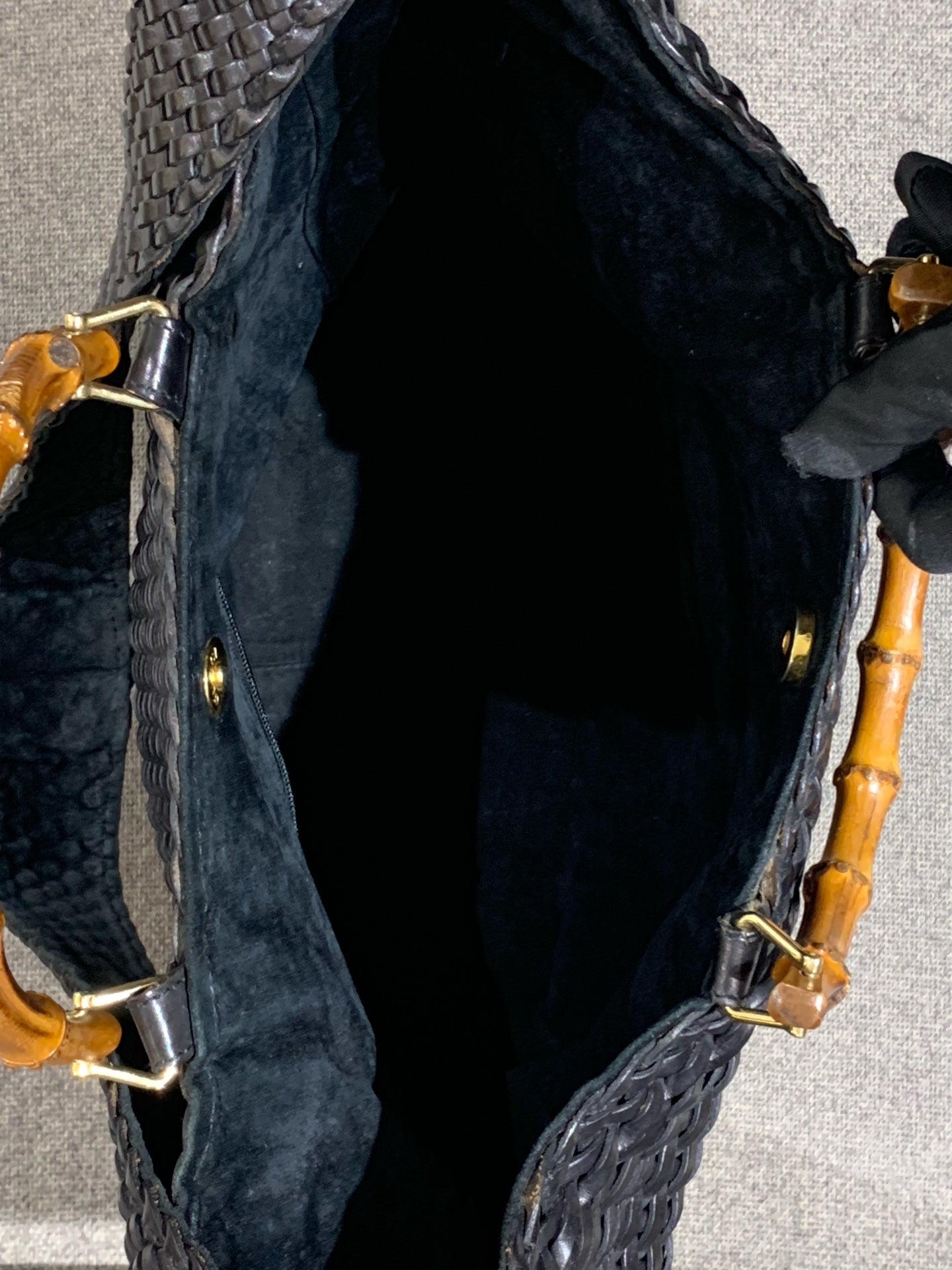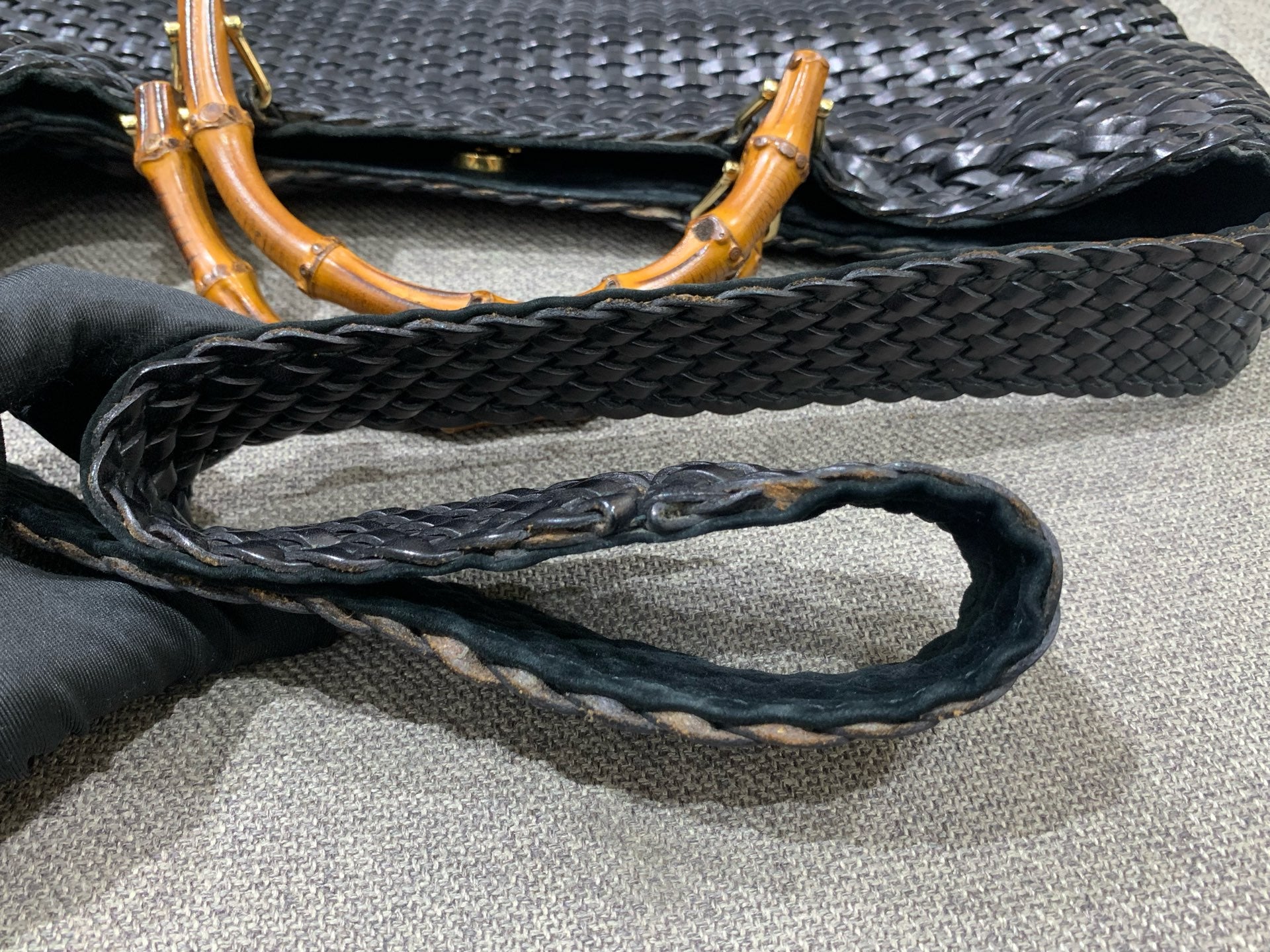 This vintage Gucci Bamboo Woven Tote is in good pre-owned condition, showcasing a classic design with signs of gentle use consistent with its age. The woven leather exterior maintains its structure and rich black color, though some minor softening and surface wear are present, particularly along edges. The iconic bamboo handles are well-preserved with a lovely patina. The gold-tone hardware shows noticeable wear and discoloration, especially on the magnetic snap closure, and the leather shoulder strap exhibits wear and fraying along the edges. The interior is generally clean with some light dust and minor marks.