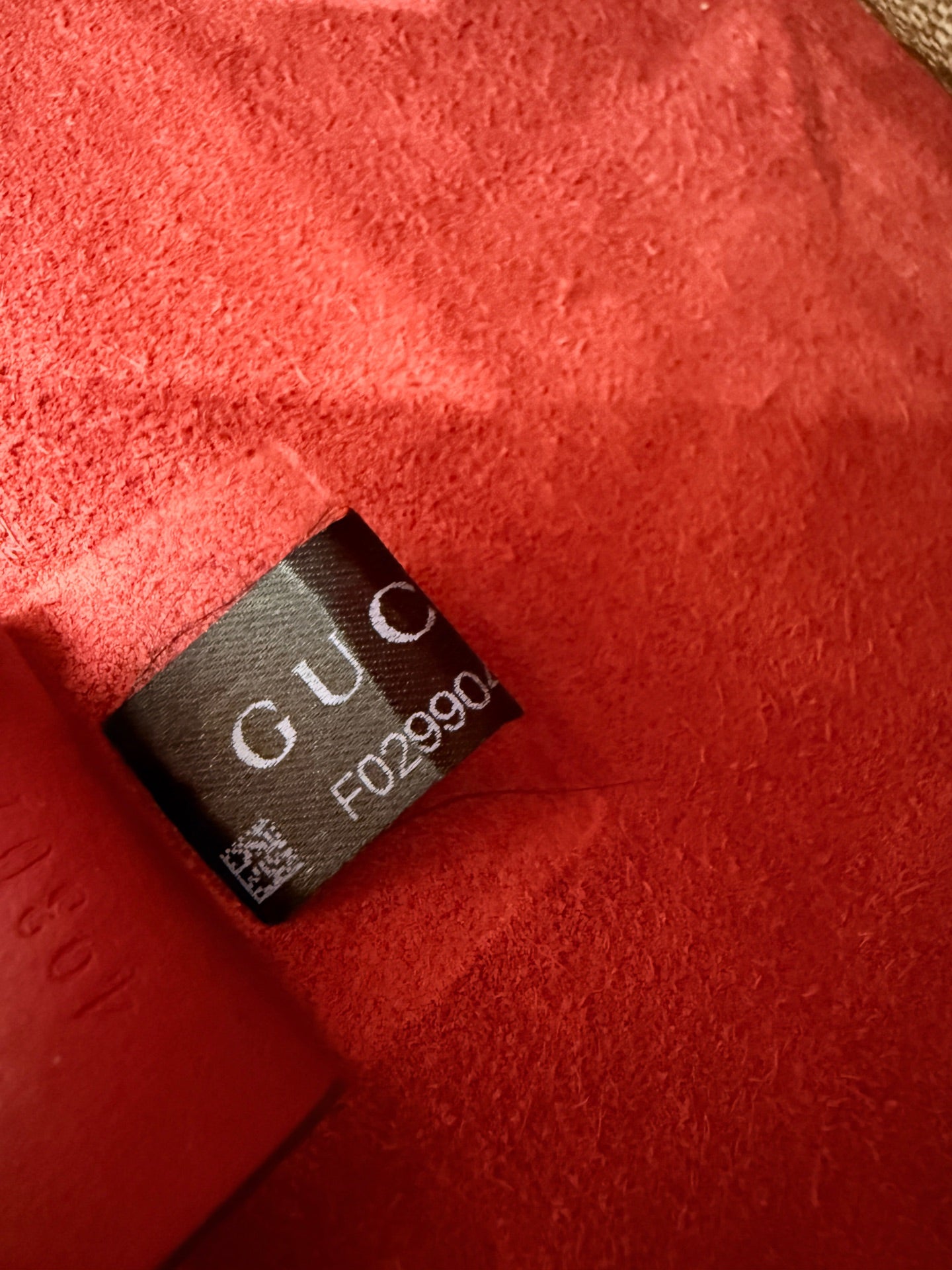The interior of the bag is lined with luxurious red suede, offering a soft and protective environment for essentials. A central compartment is visible, with the underside of the flap lined in GG Supreme canvas, mirroring the exterior. A discreet brand tag with the serial number and QR code is located within.