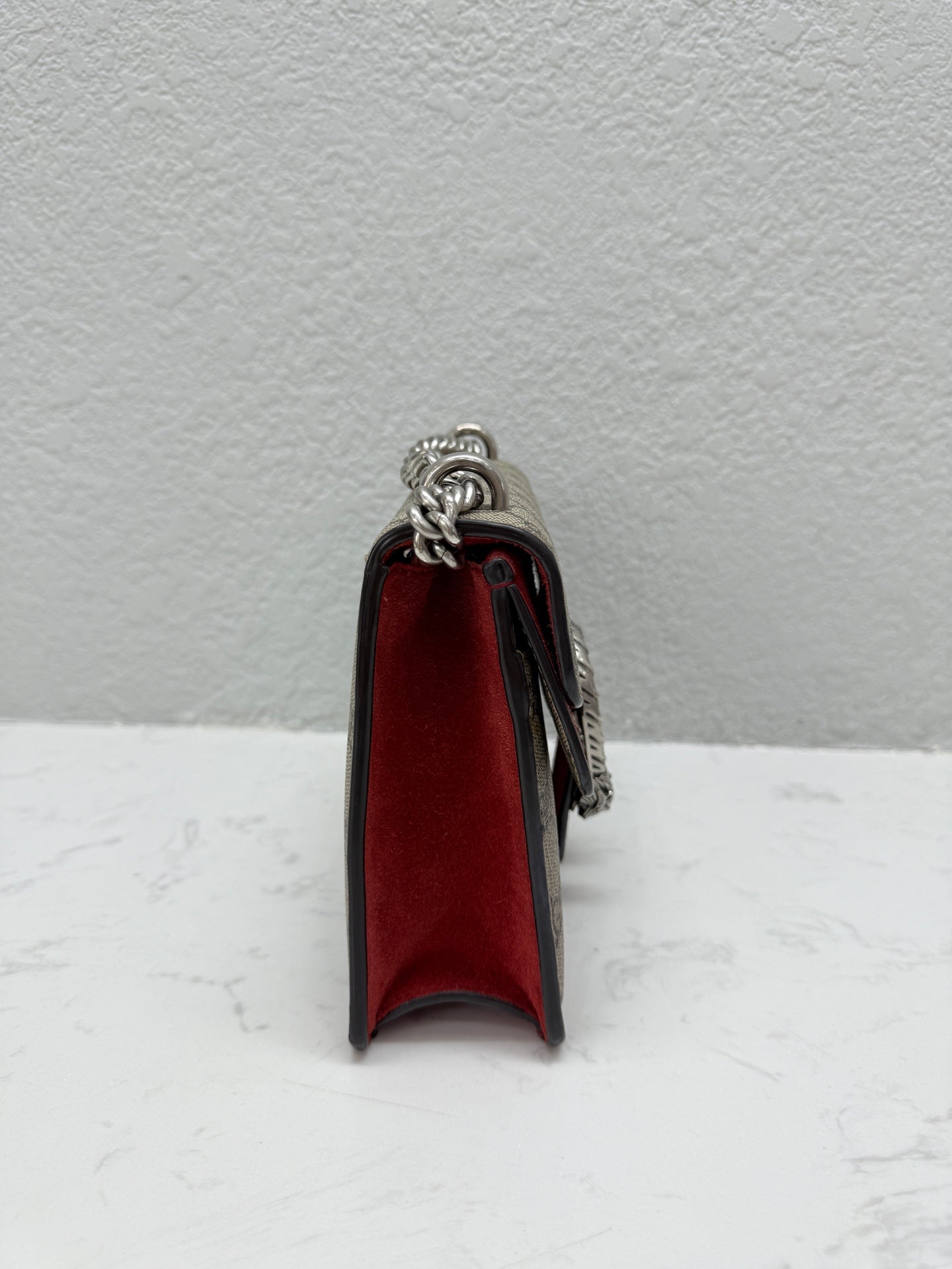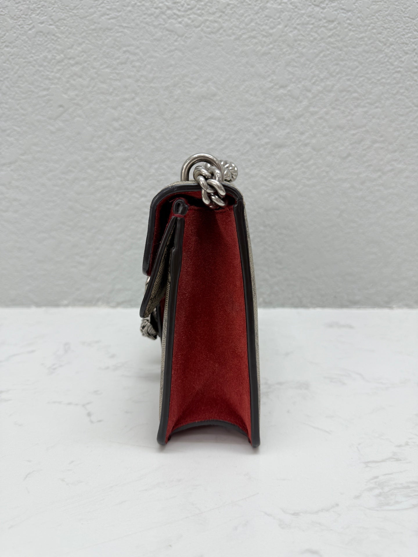 The Dionysus Mini is recognizable by its unique antique silver-tone tiger head closure, inspired by the Greek god Dionysus. Its compact size makes it an ideal accessory for day-to-evening wear, while the contrasting GG Supreme canvas and red suede materials create a luxurious and eye-catching aesthetic.