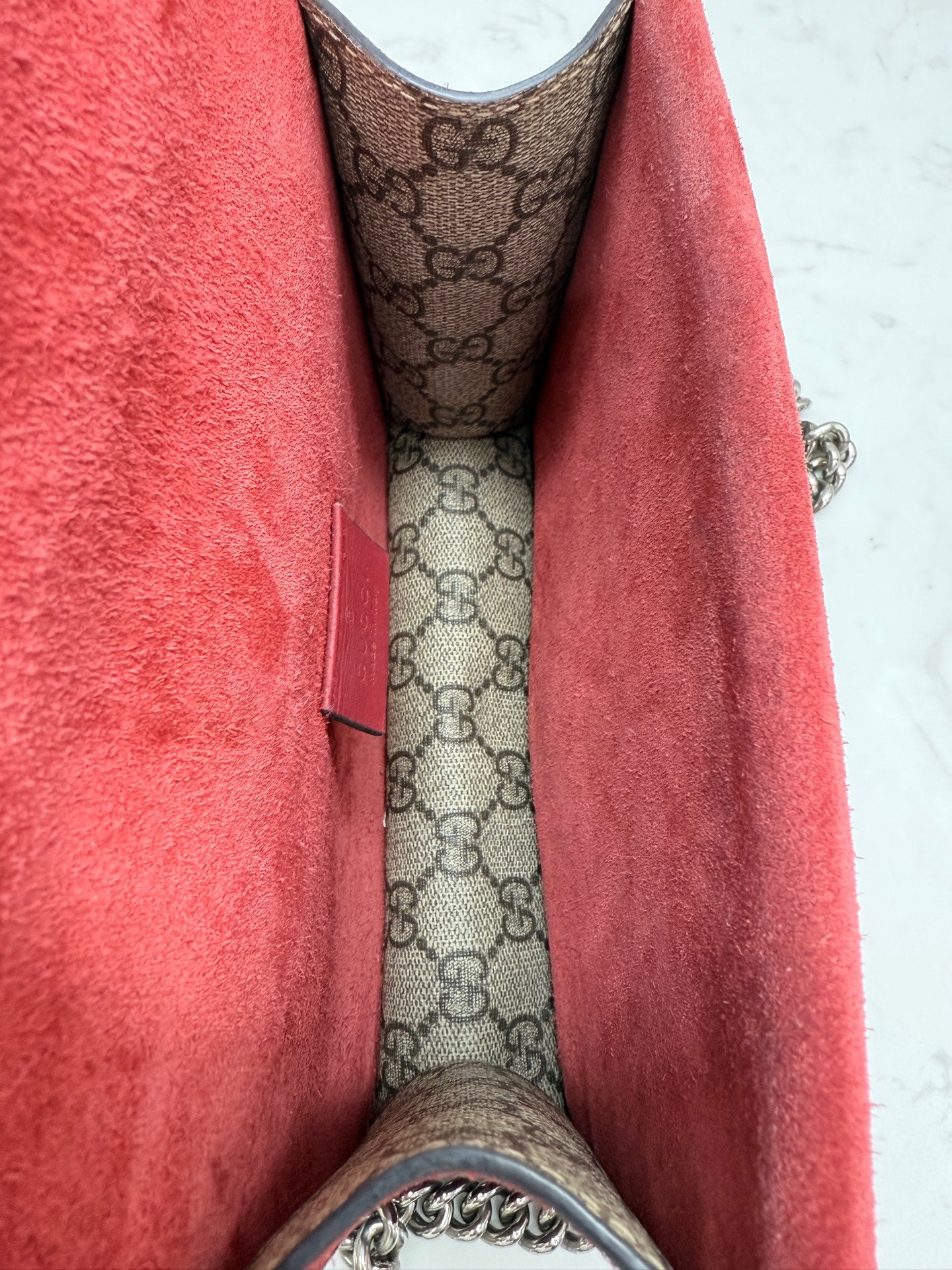 This Gucci Dionysus Mini bag is presented in a very good, pre-owned condition, rated 96% new. The GG Supreme canvas exterior maintains its structure and vibrant pattern with minimal signs of wear. The red suede gussets and detailing are well-preserved, showing only light surface variations consistent with gentle use. The silver-tone hardware, including the iconic tiger head spur closure and chain strap, remains bright with only minor, superficial hairline scratches.