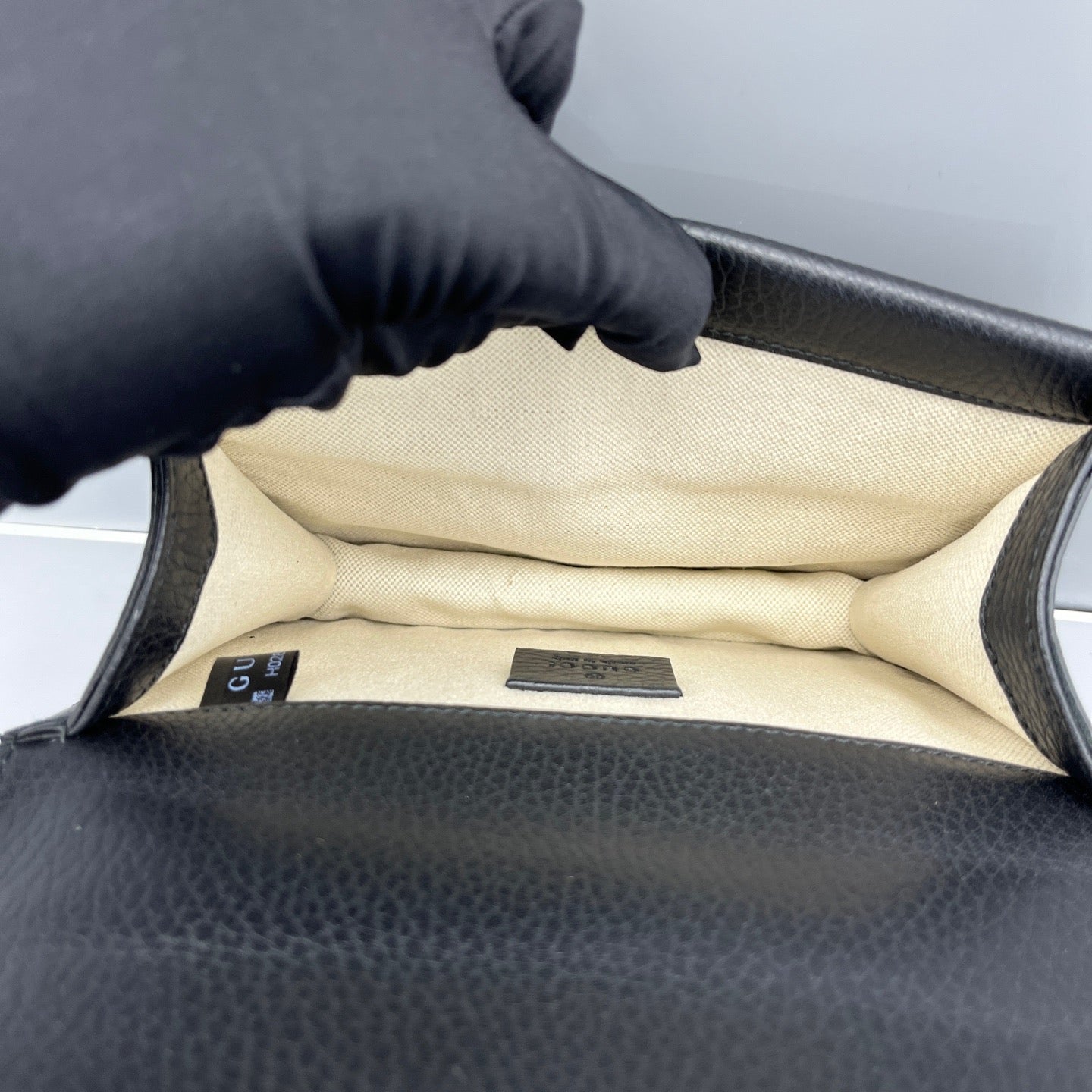 Crafted from supple black pebbled leather, this Dionysus bag features a structured silhouette with a front flap closure. The leather exhibits a fine grain texture, offering both durability and a sophisticated aesthetic. Subtle tonal stitching enhances the bag's clean lines.