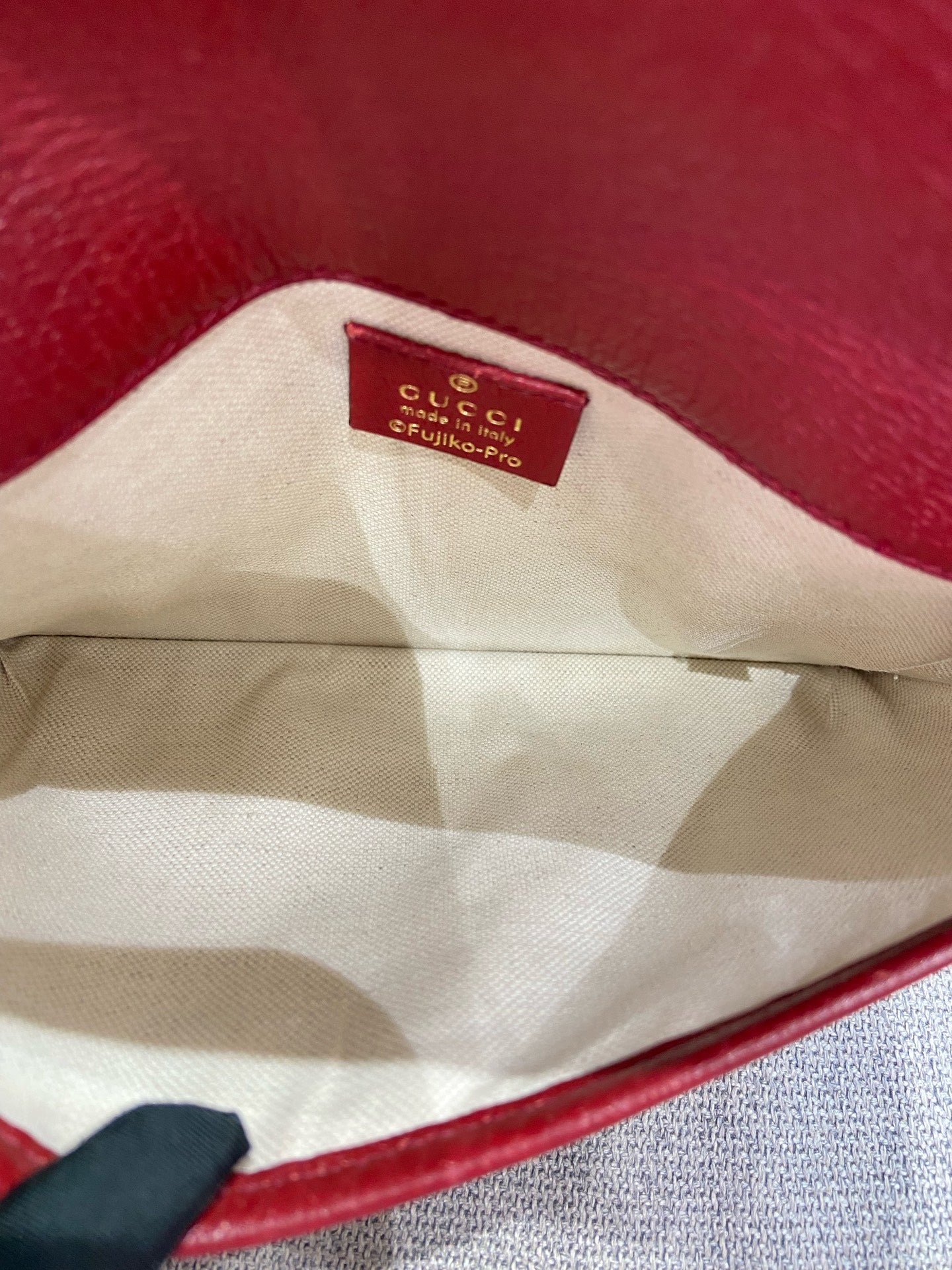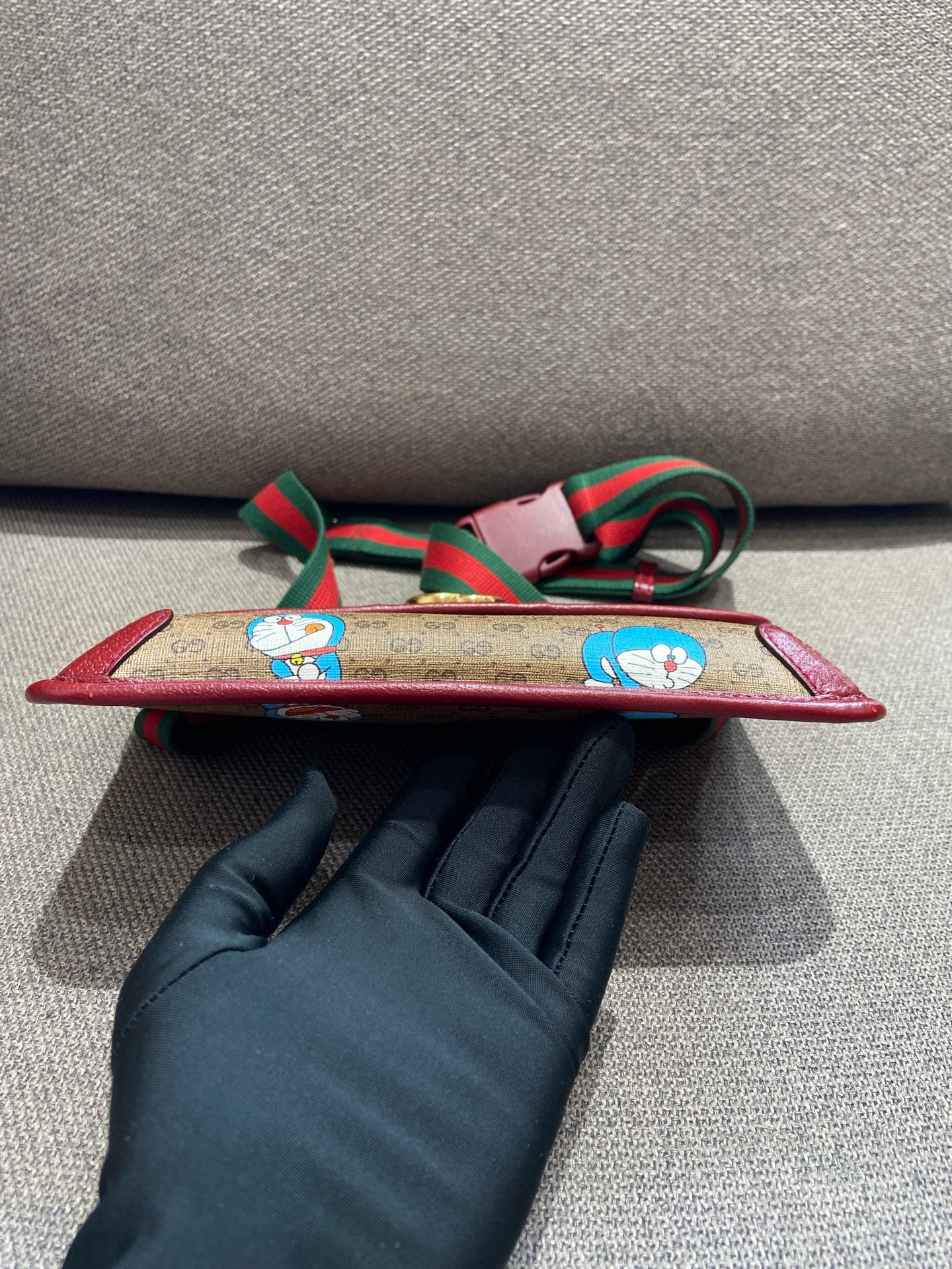 This Gucci Doraemon collaboration belt bag is presented in a remarkable 99% new condition. The exterior GG Supreme canvas with Doraemon motifs is vibrant and clean, showing virtually no signs of wear. The red leather trim is pristine, and the iconic red and green Web strap is excellent. All hardware retains its original luster. The interior lining is impeccably clean. This piece has been exceptionally well-preserved, reflecting minimal, if any, prior use.