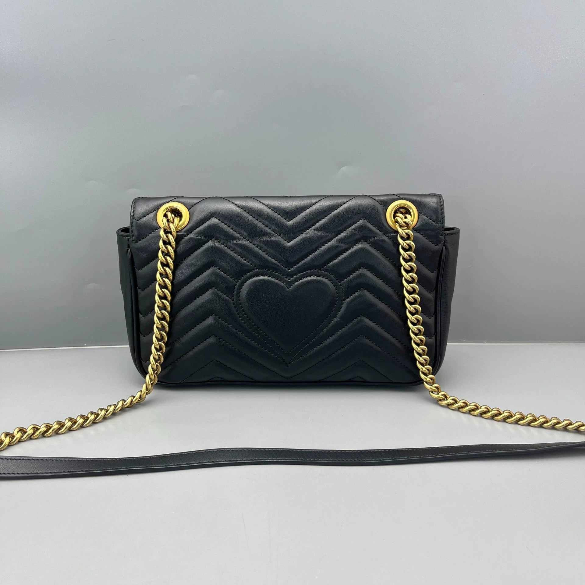 The signature chevron quilting and prominent GG logo are instantly recognizable. The versatile chain strap can be worn as a shoulder strap with a 55cm drop or as a top handle with a 30cm drop, offering multiple styling options. The heart detail on the back adds a subtle, charming touch.