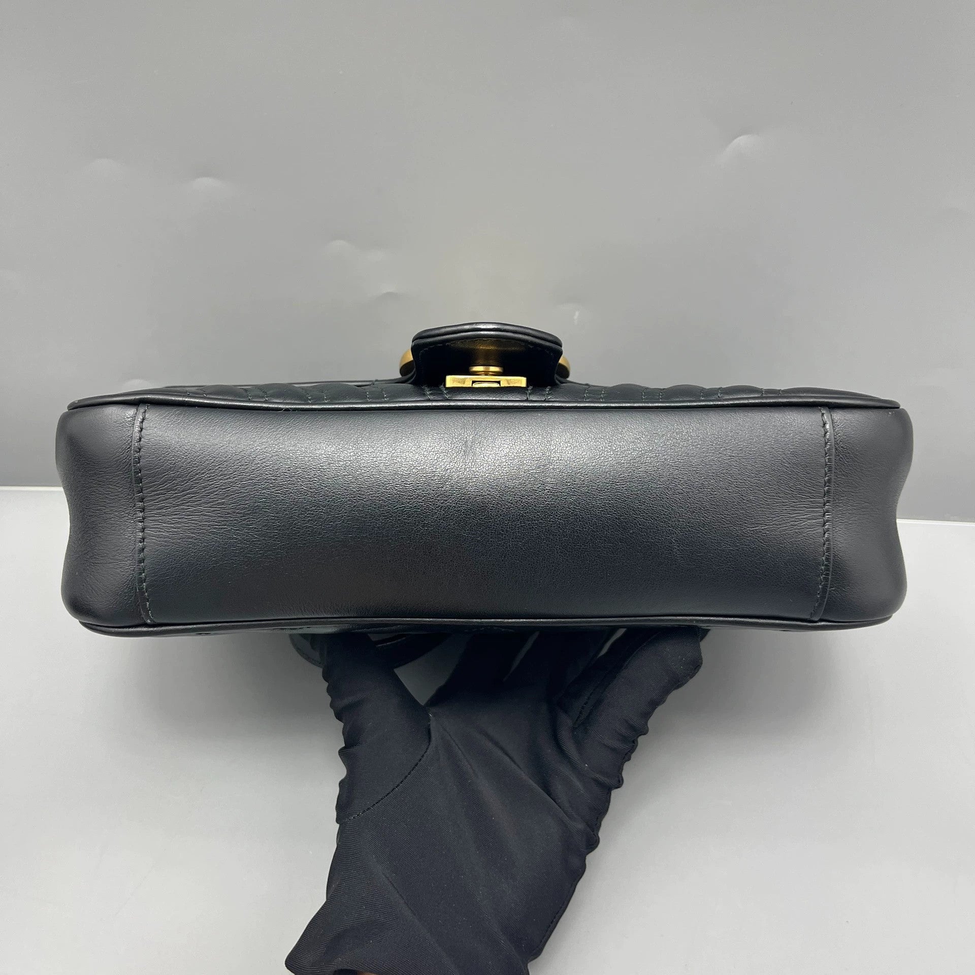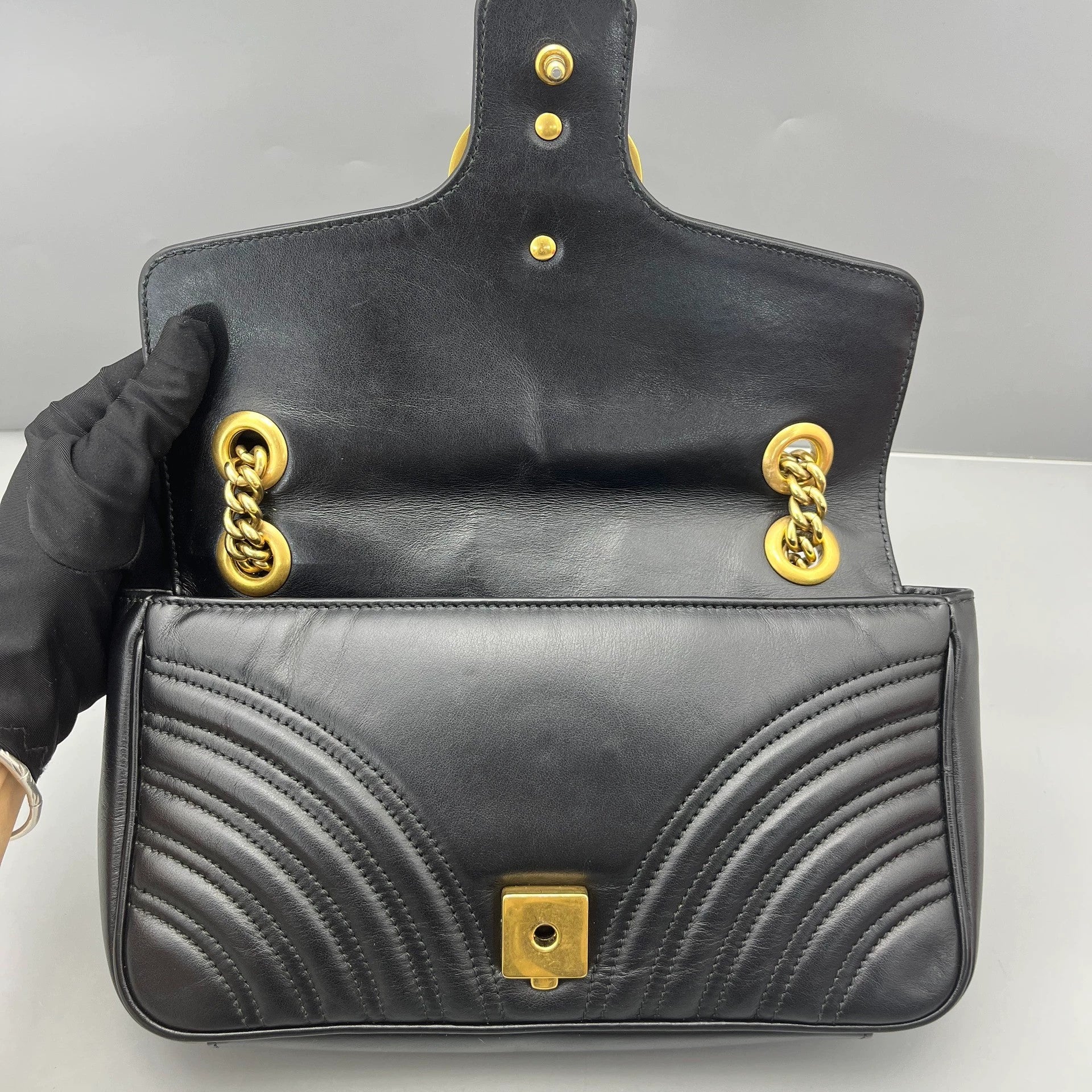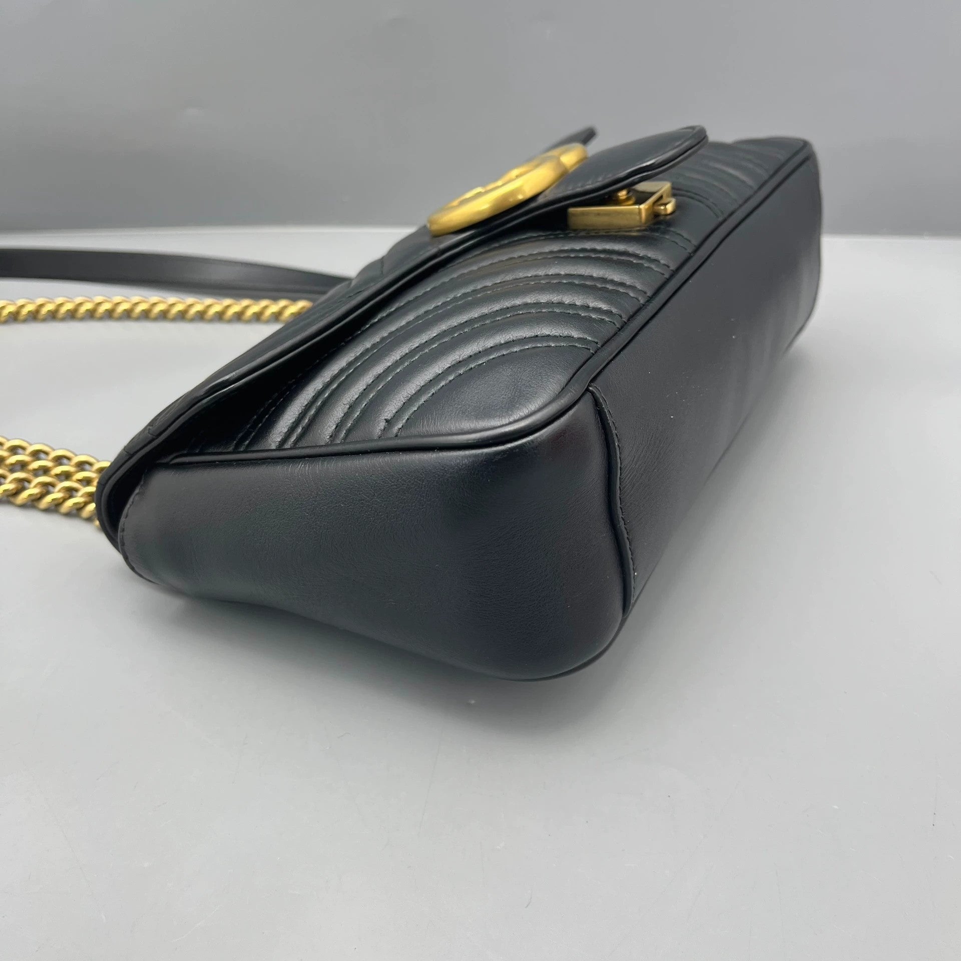 This Gucci GG Marmont 2.0 Small Shoulder Bag is in excellent pre-owned condition, rated as 97% new. The black matelassé leather exterior is well-preserved, showing minimal signs of wear. The iconic double G hardware in antique gold-tone is shiny with very faint surface scratches. The chain strap with a leather shoulder pad is in excellent condition, ensuring comfortable wear. The interior is clean with no visible stains or damage, indicating careful previous ownership. Overall, the bag maintains its structured silhouette and luxurious appeal.